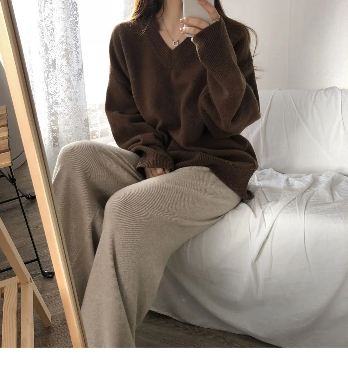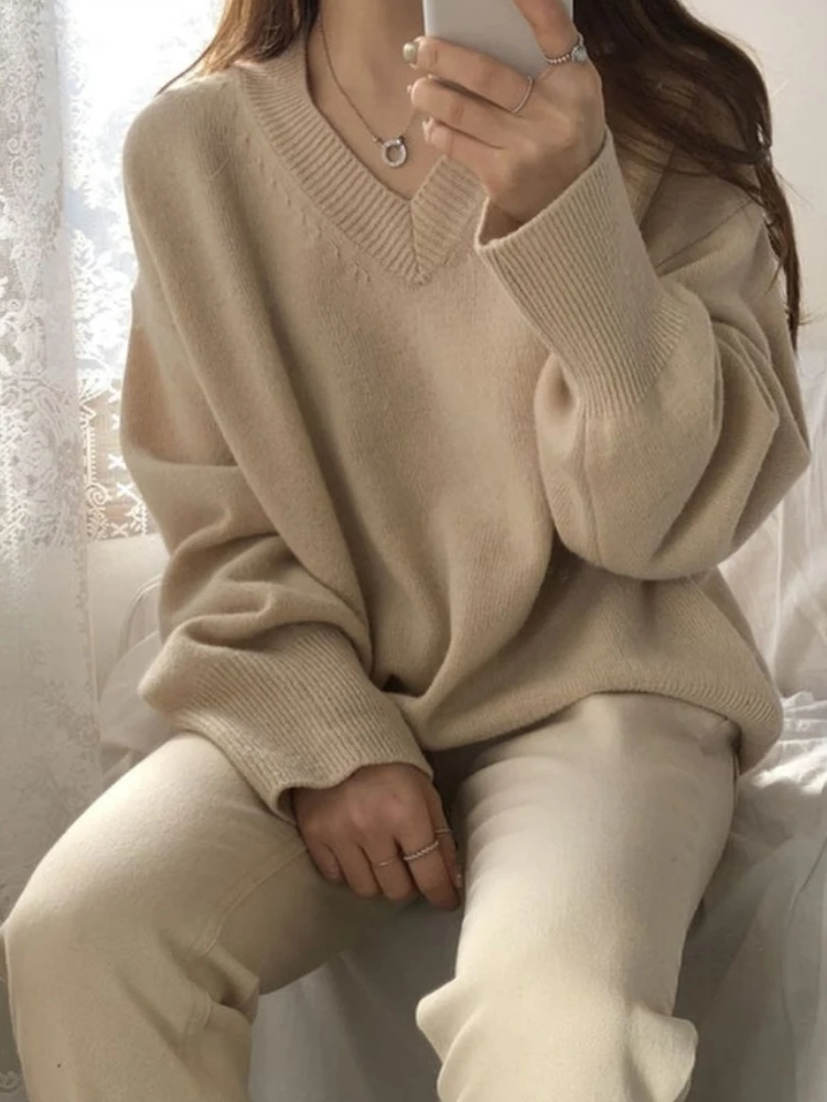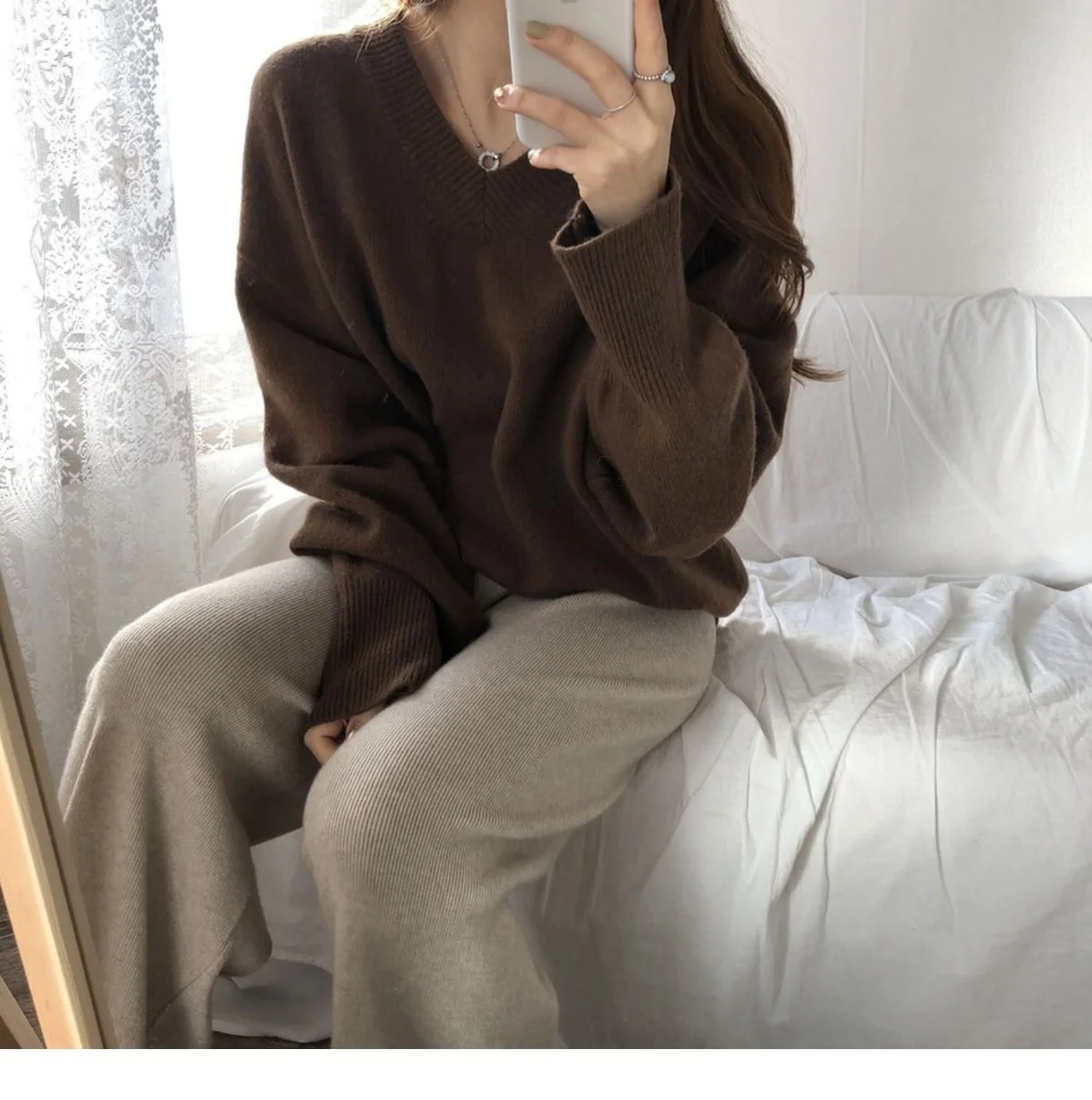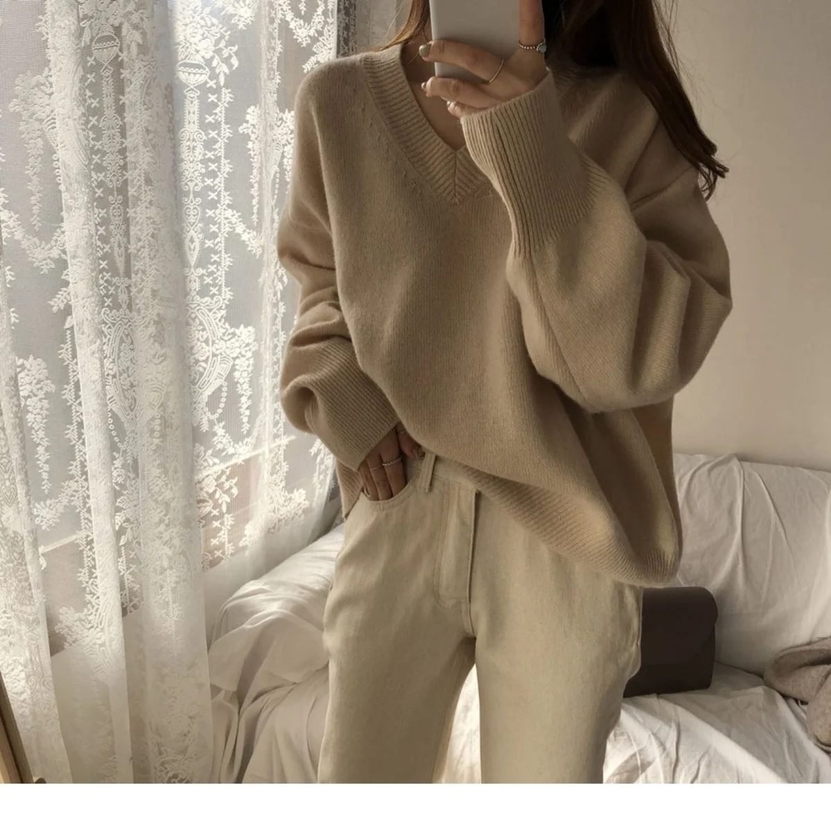 Sweater Pullovers Women Spring New Chic Solid V-neck All-match Loose Simple Female Fashion Vintage Elegant Clothing Leisure Soft