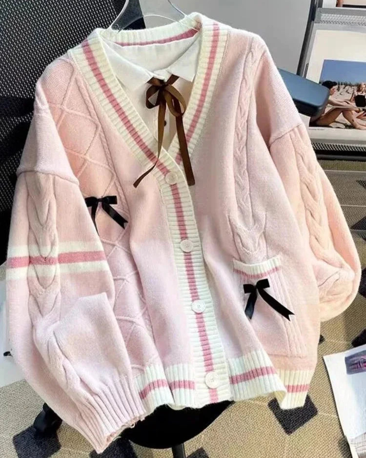 Sweet Bow Knitted Cardigans Y2k Aesthetic All Match Contrast Color Coats Fashion Single Breasted Women Kawaii JK Sweaters Jumper