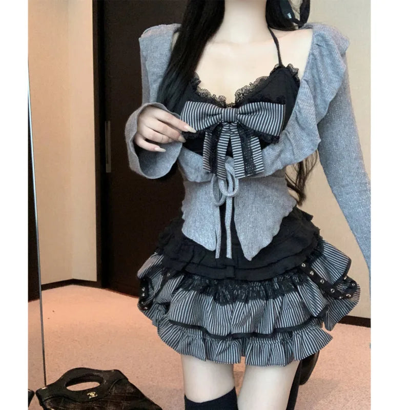 Sweet Bow Lolita 3 Pcs Set Swomen Autumn Lace Up Ruffles Cardigan Sexy Slim Strapless Vest Top High Waist Ruched Skirt Suit