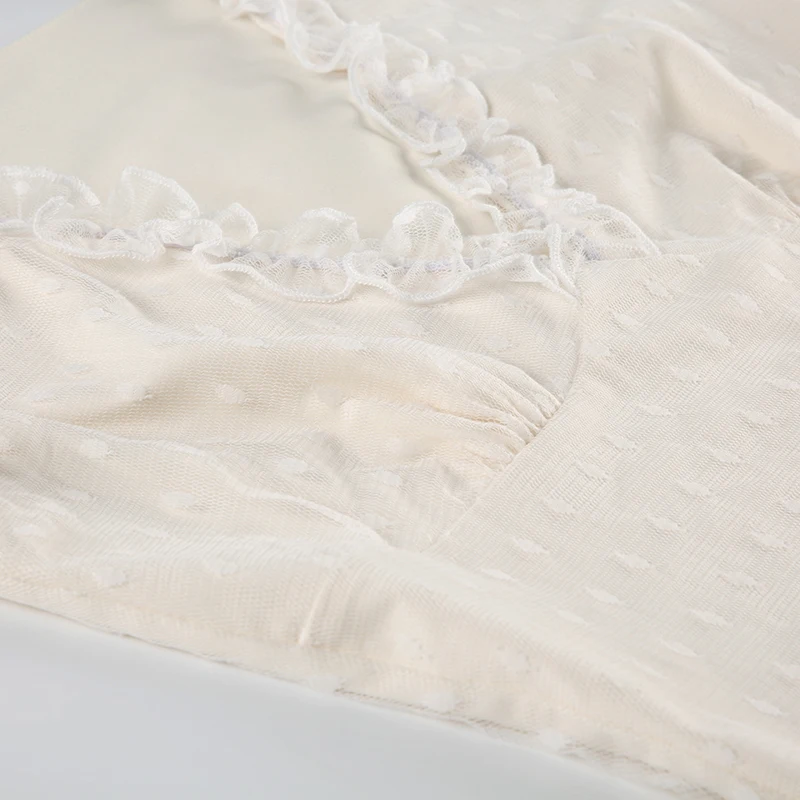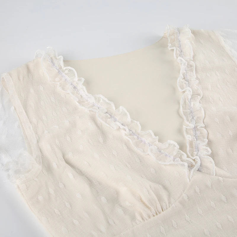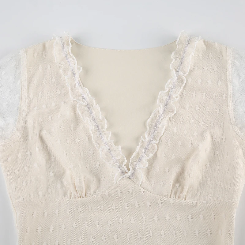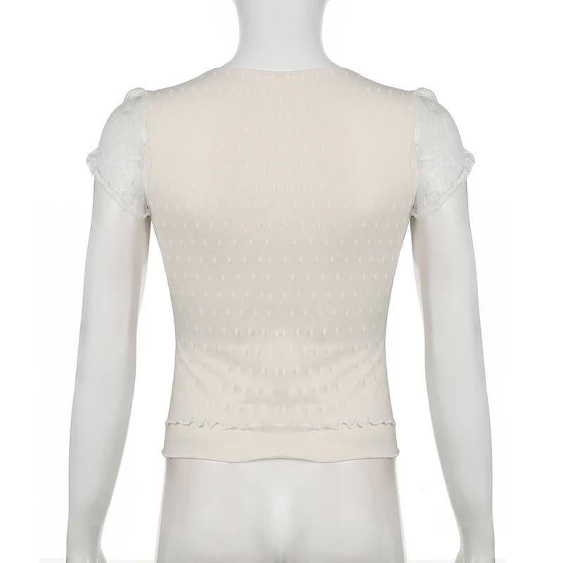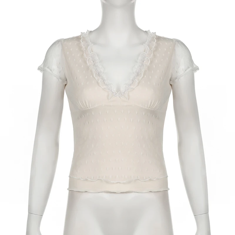 Sweet Cute Lace Trim Mesh T Shirt Sexy Slim Deep V-Neck Short Sleeve Tees Women 2024 Summer Fashion Streetwear Ladies