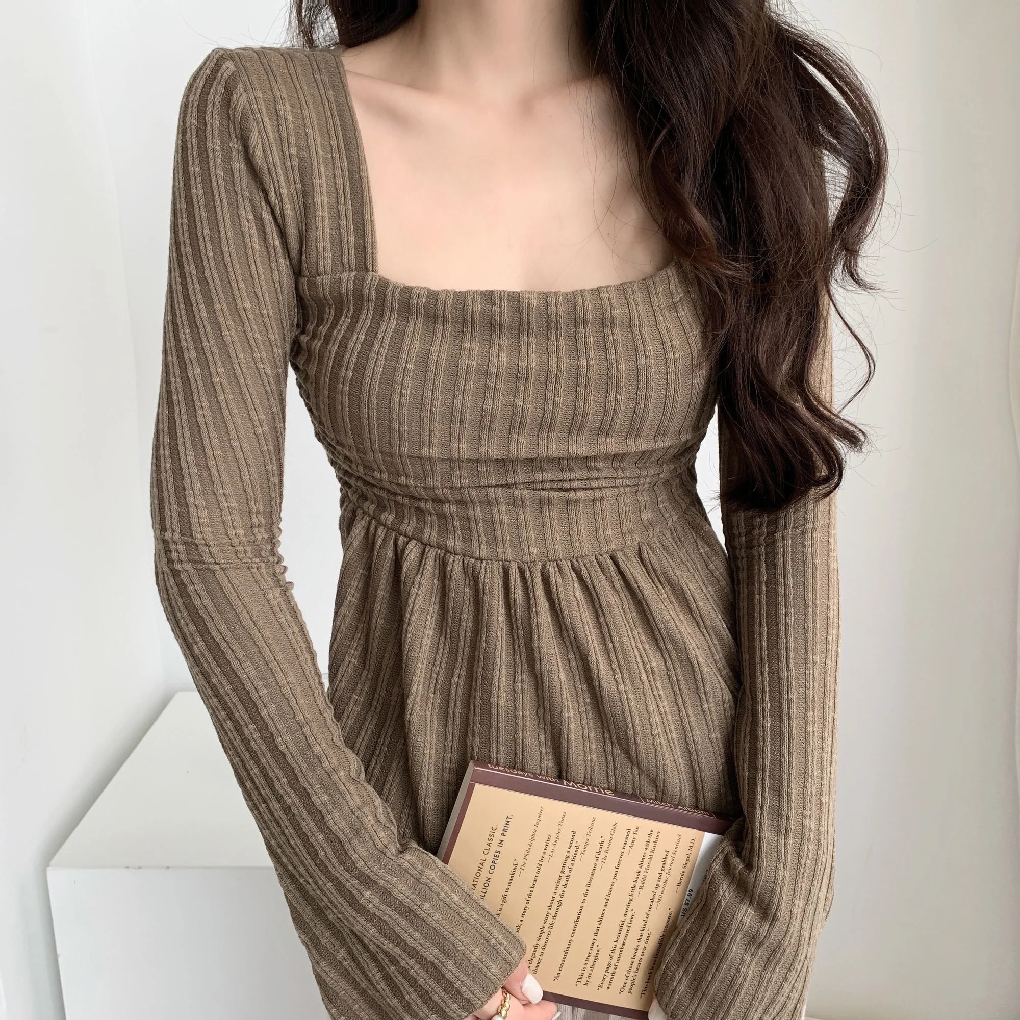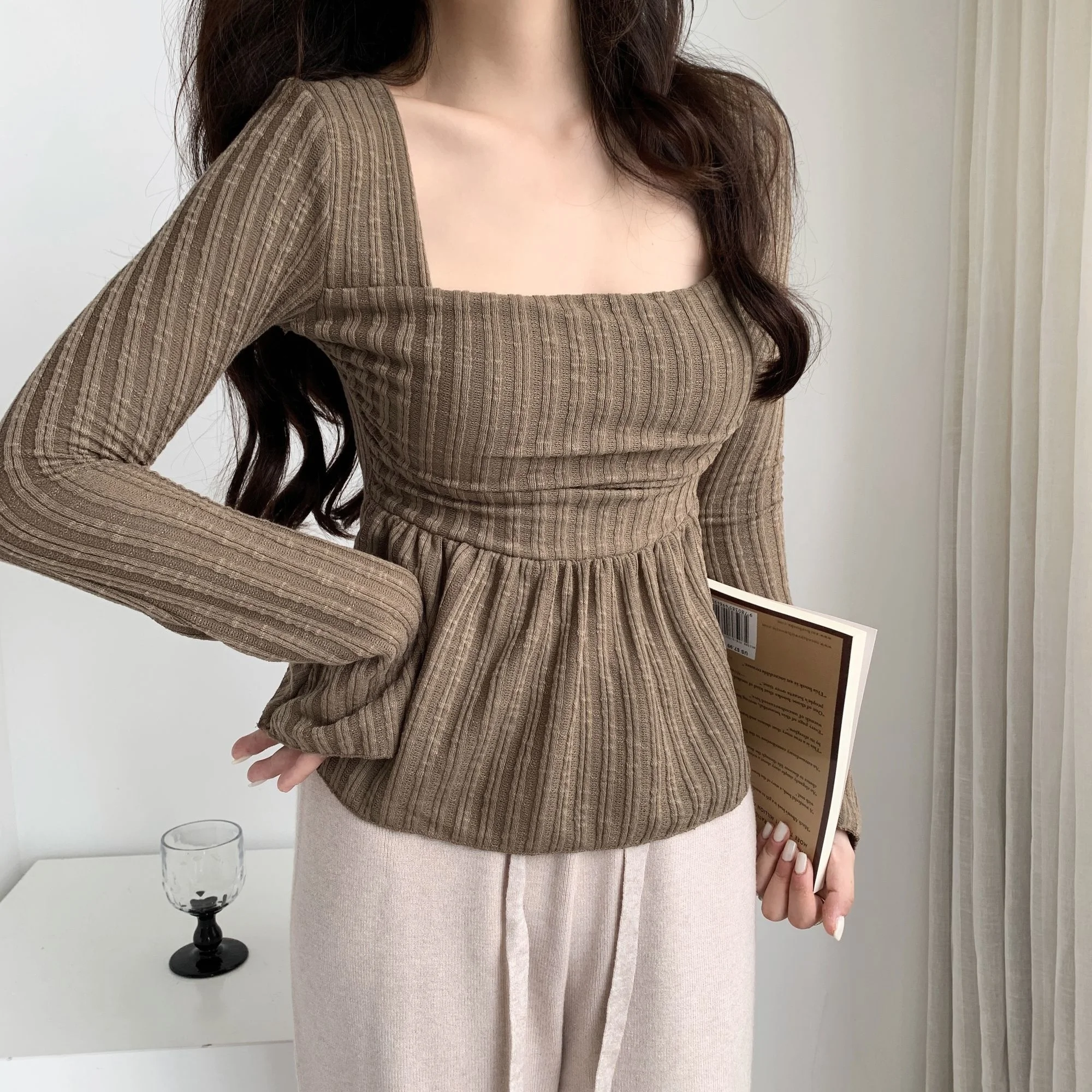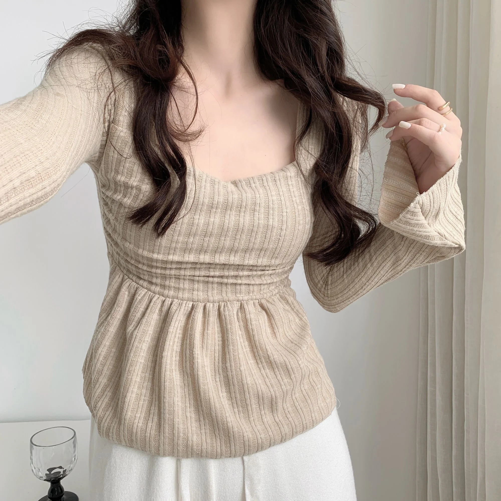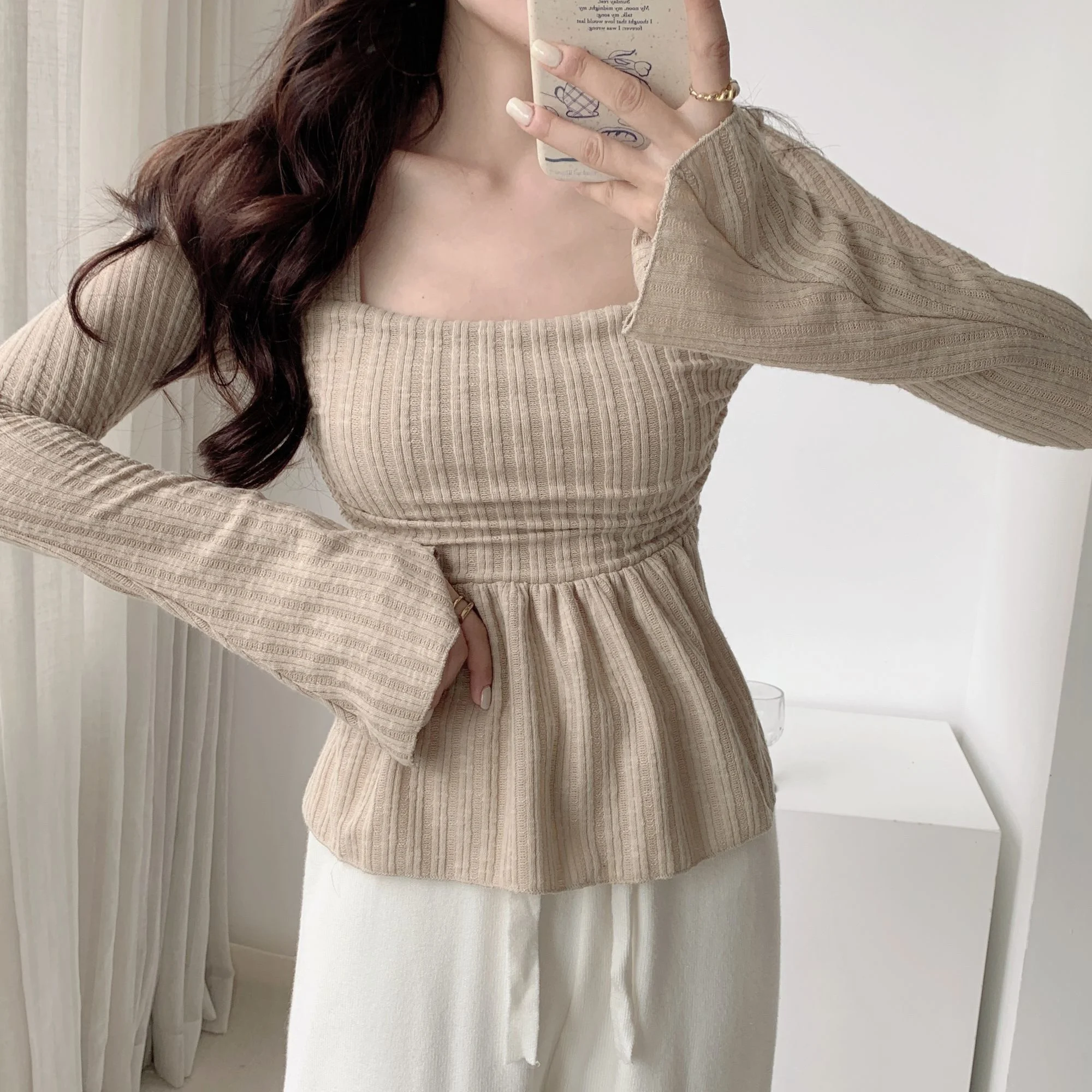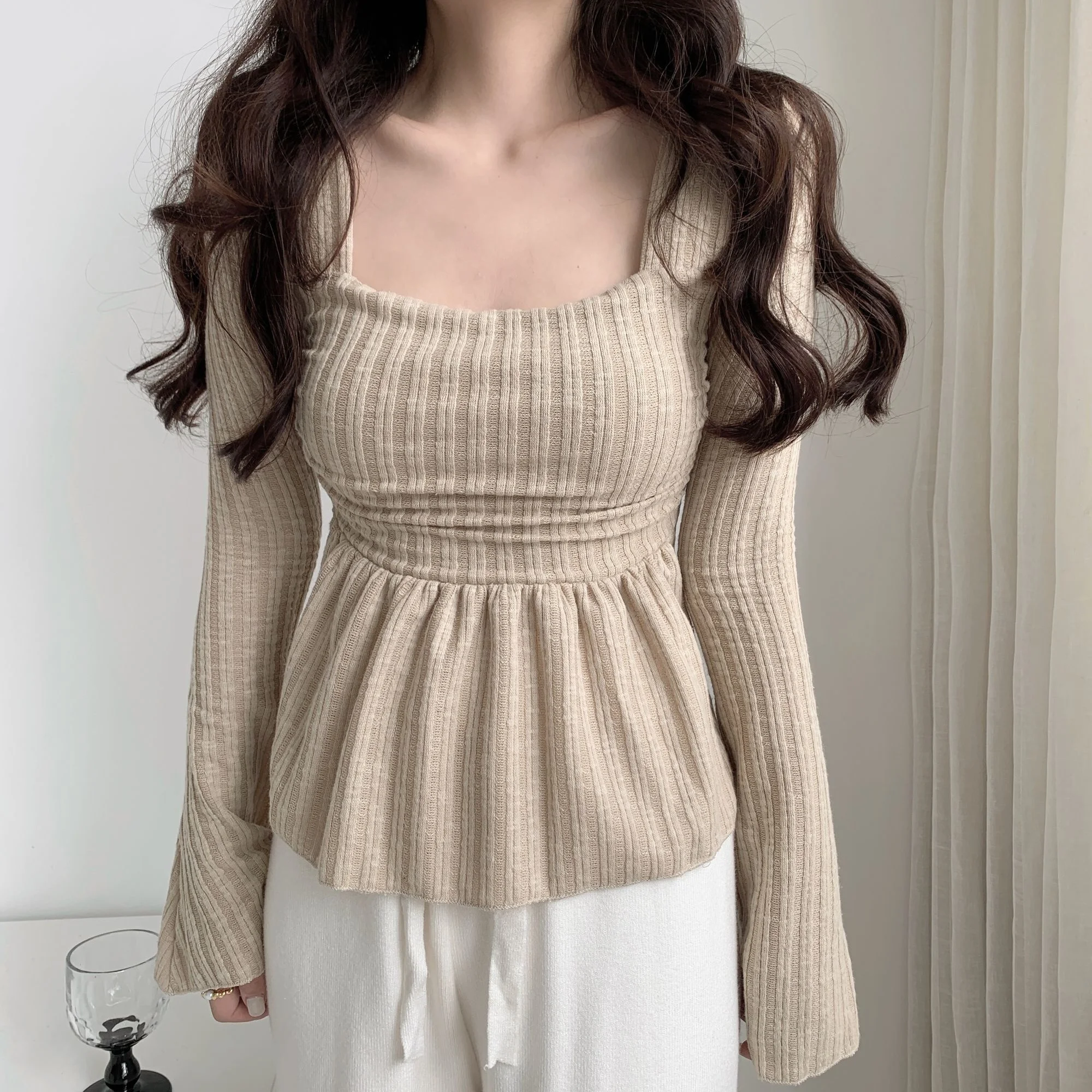 Sweet Gentle Cute Square Neck Flare Sleeve Loose Casual Stripe T-shirt Fashion Sexy Korean Women Tops Elegant
