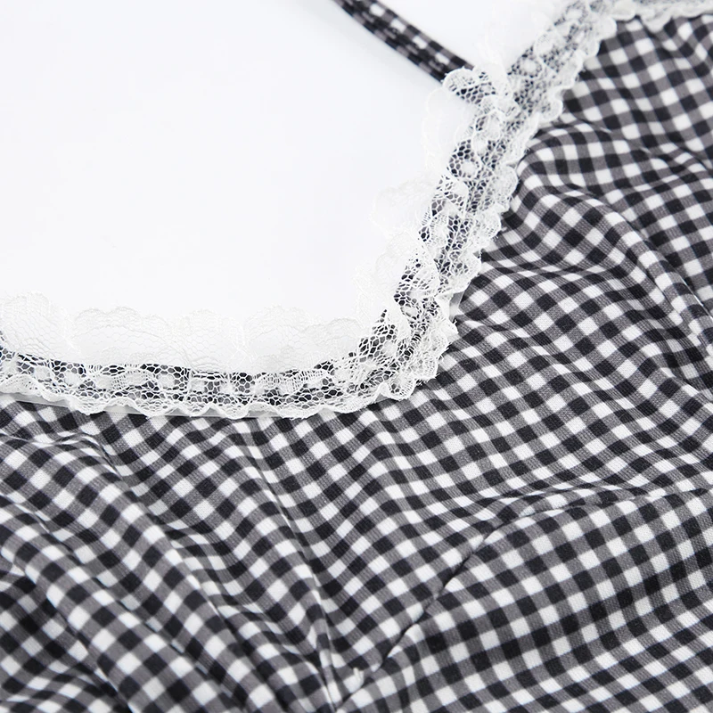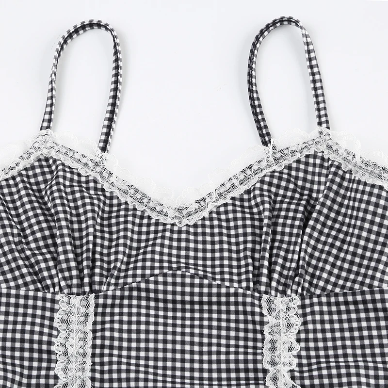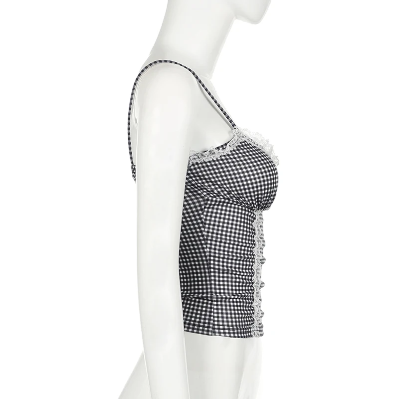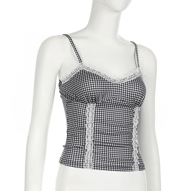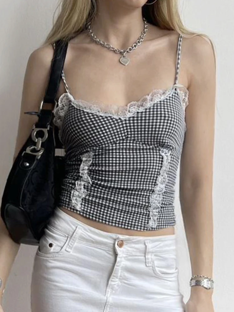 Sweet Patchwork Lace Trim Camis Top Sexy Slim Slash Neck Sleeveless Tank Tops Women 2024 Summer Fashion Streetwear Lady