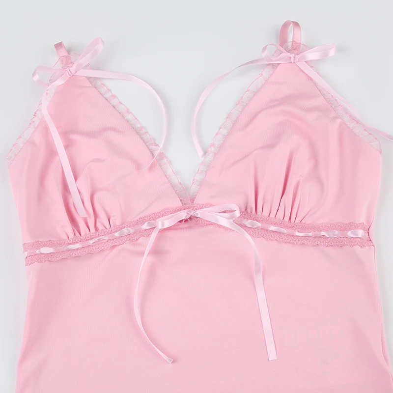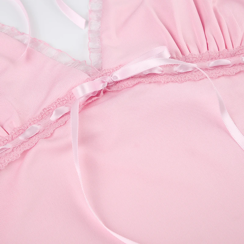 Sweet Solid Lace Trim Bandage Camis Top Casual Slim Deep V-Neck Sleeveless Tank Tops Women Summer Streetwear Fashion