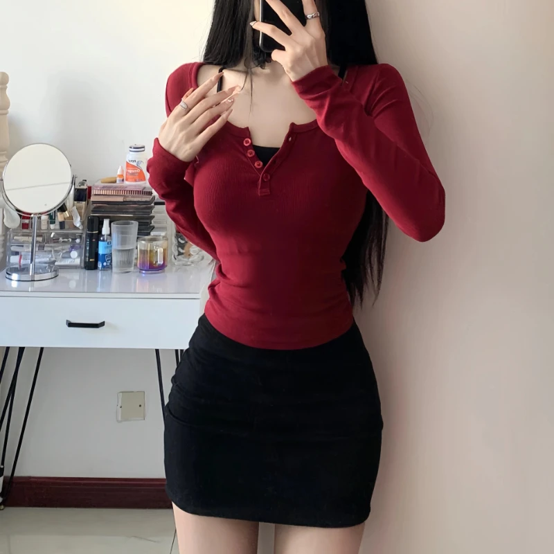 T-shirts Women Streetwear Solid All-match Slim Korean Style Clothes Sweet Sexy Girls Autumn Long Sleeve Top Trendy Chic T Shirt