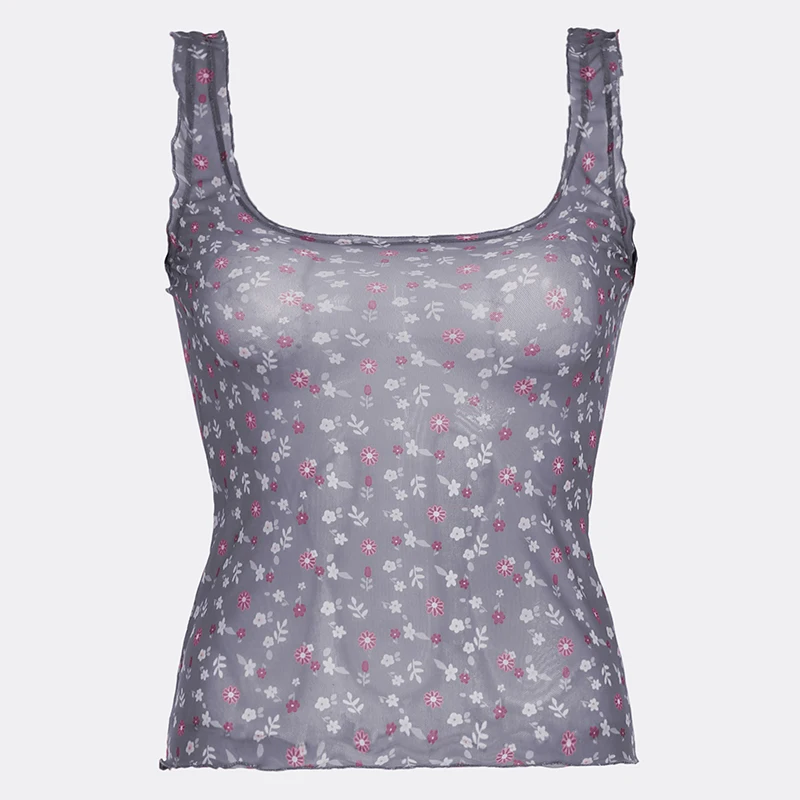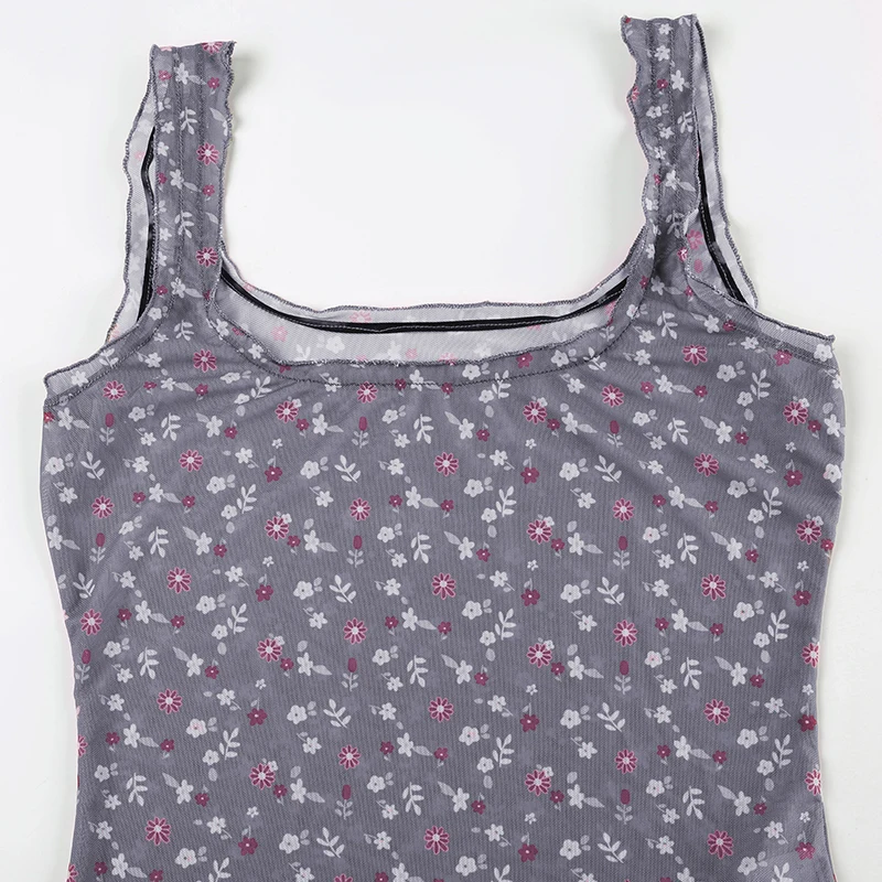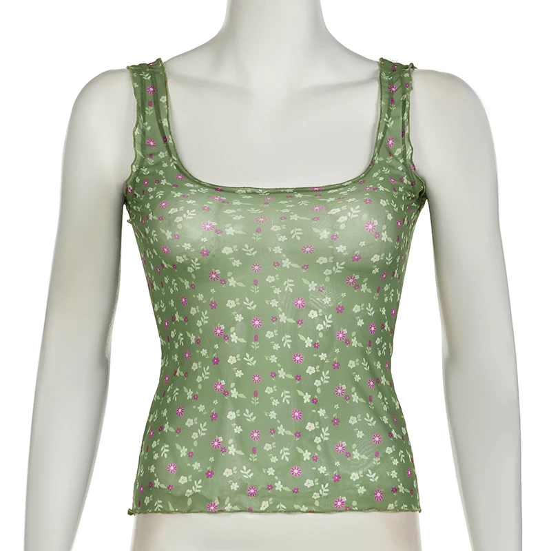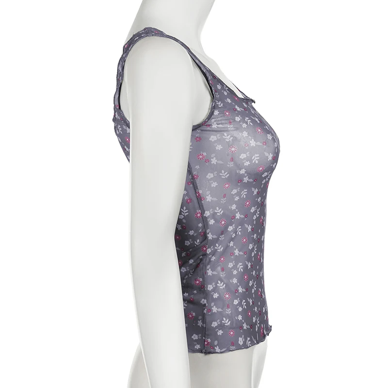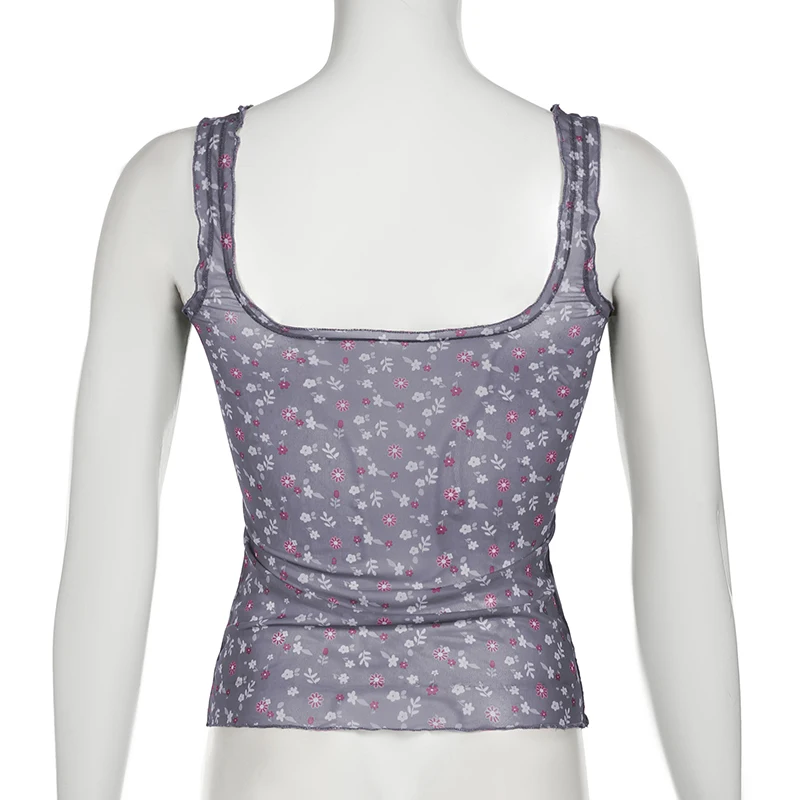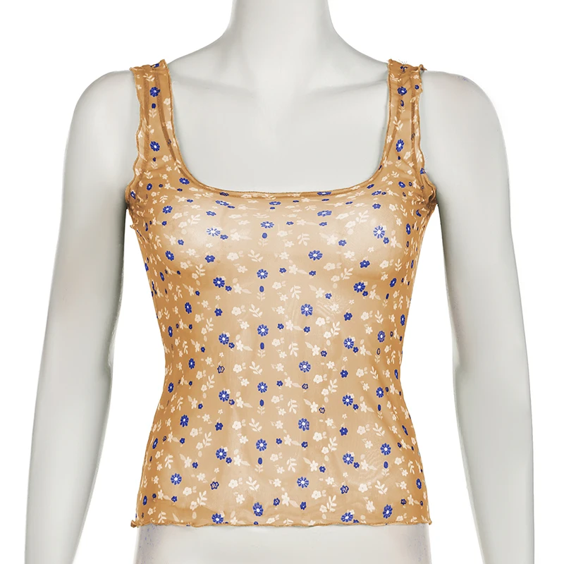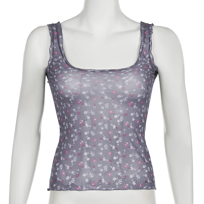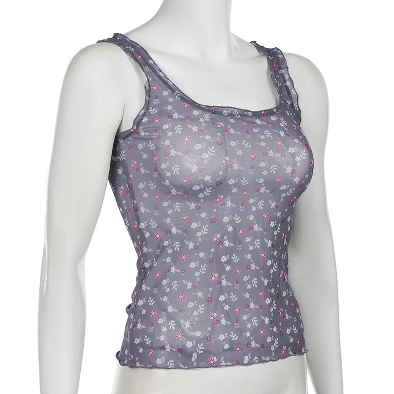 Vintage Frill Y2K Small Flowers Printing Mesh Top Vest See Through Holidays 2000s Aesthetic Summer Tank Tops Female