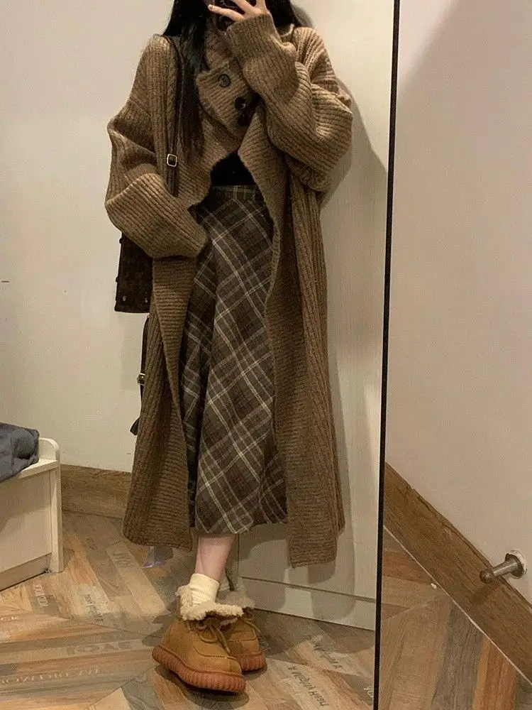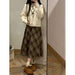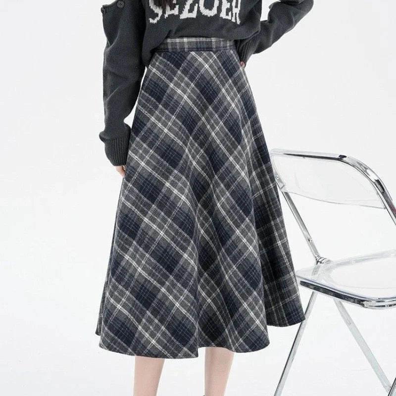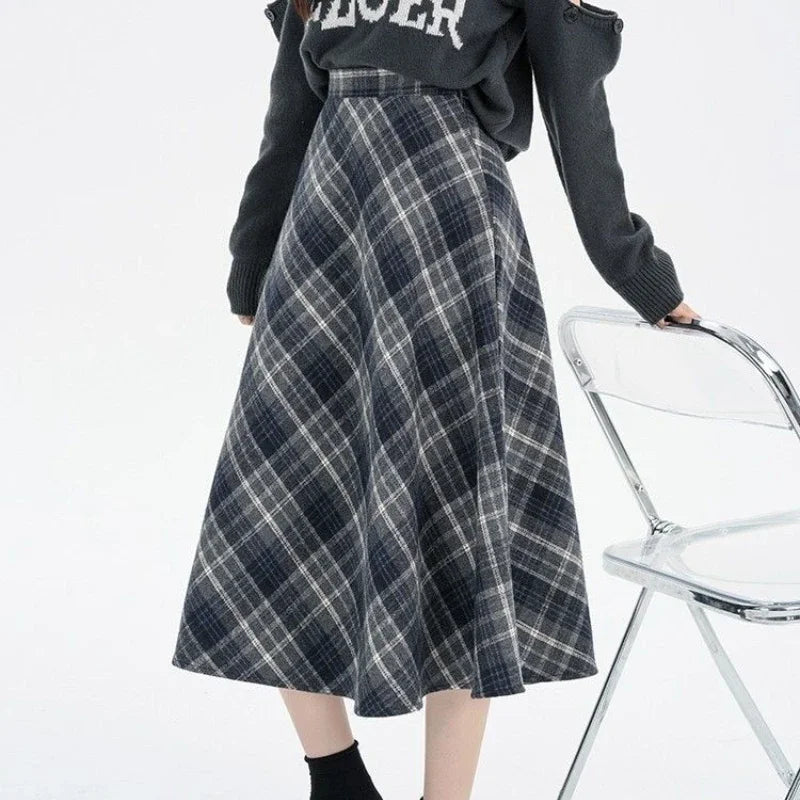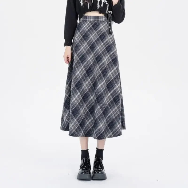 Vintage Plaid Skirt Women Preppy Style Autumn Winter Long Skirts Retro High Waist Streetwear Casual A-line Midi Skirts