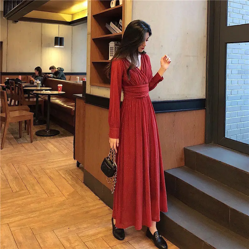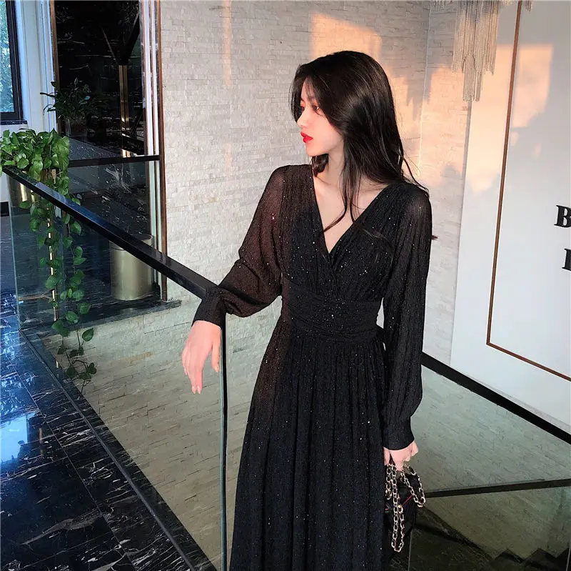 Vintage Sexy Maxi Dresses for Women Party Sequin Midi Female Casual Chiffon Slim Korean Woman