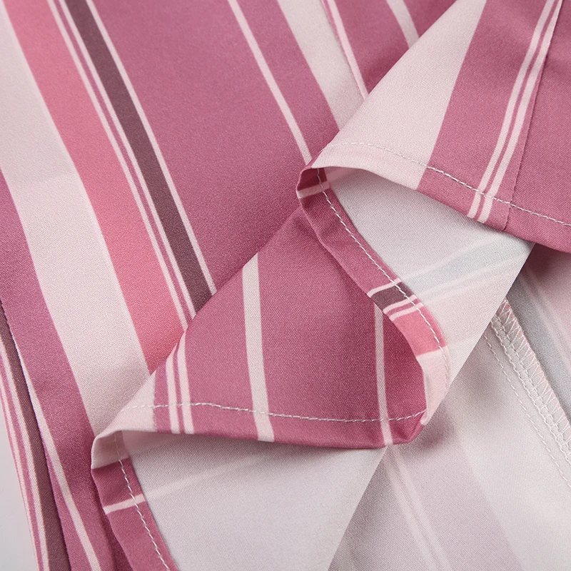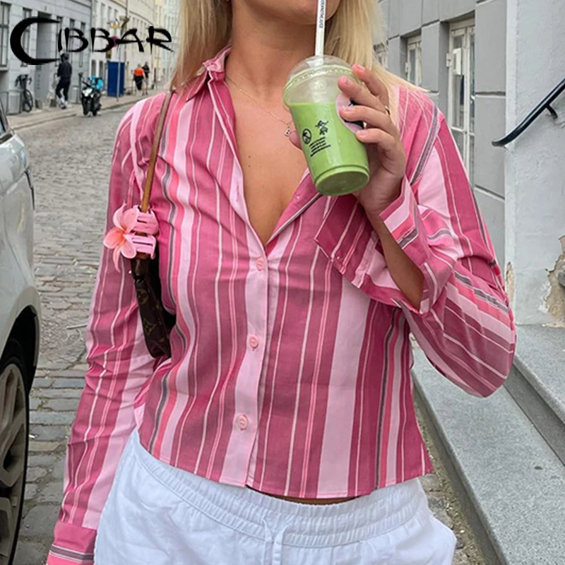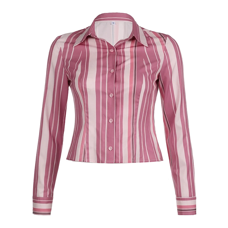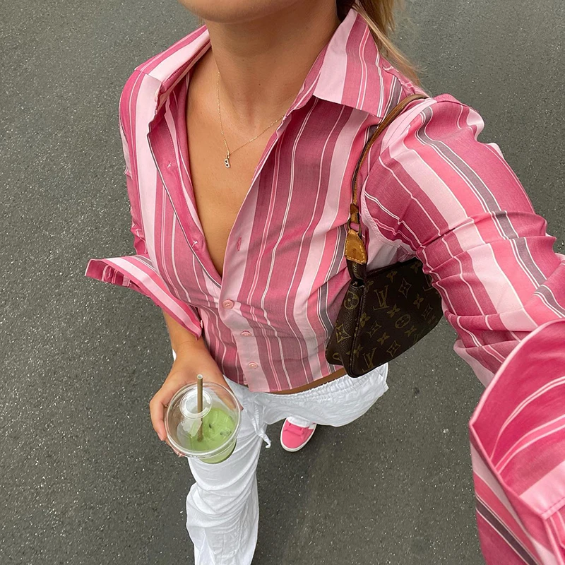 Vintage Striped Print Blouse Pink Button Up Full Sleeve Crop Top for Women y2k Sweet Tees Autumn Fashion Streetwear Shirt