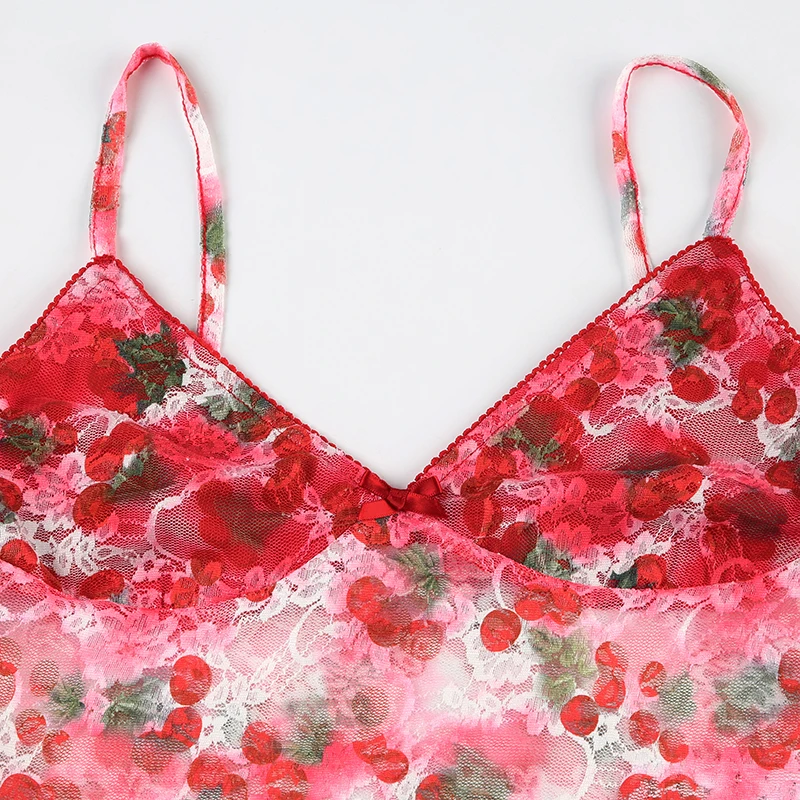 Vintage y2k Mesh Crop Top Women Summer Floral Print Sleeveless Patchwork Spaghetti Strap Tops Ladies Sexy Aesthetic Tees