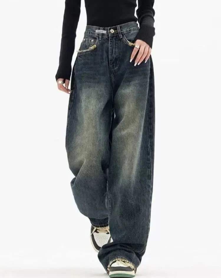 Wide Leg Jeans Women Elegant Casual Korean Fashion Style High Waist Daily Retro Washed Vintage Streeetwear Chic All-match Basic