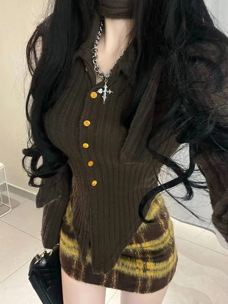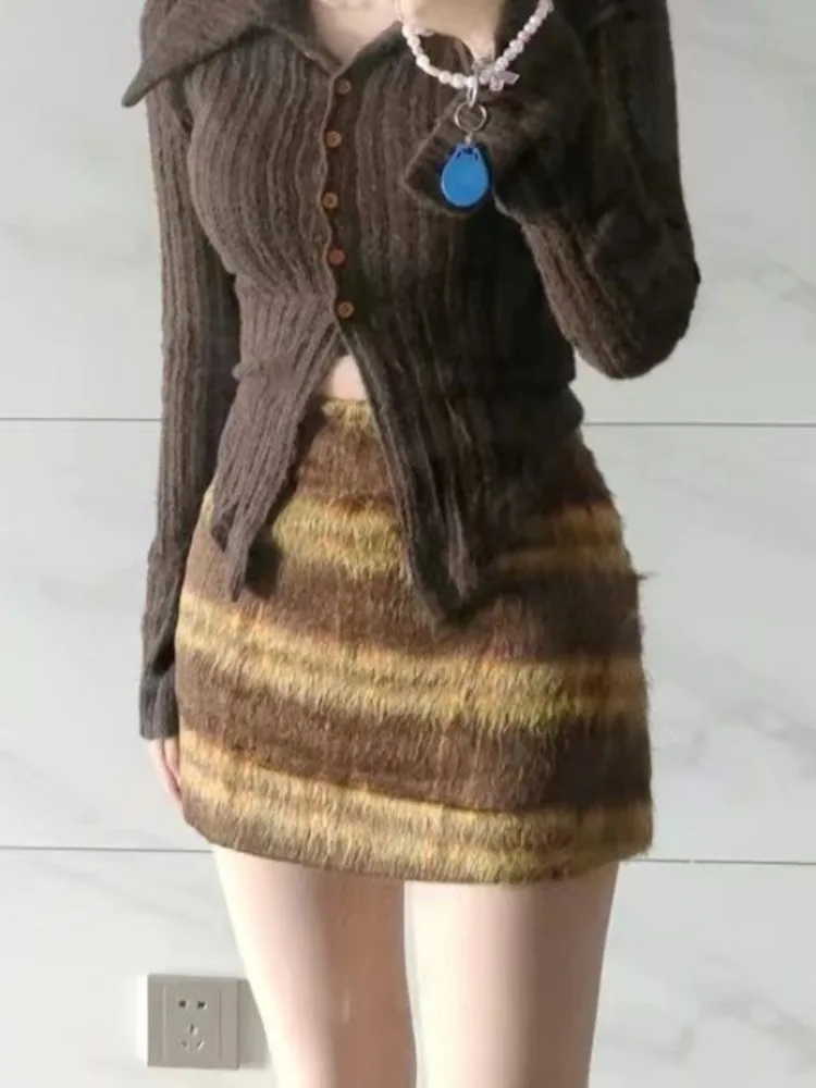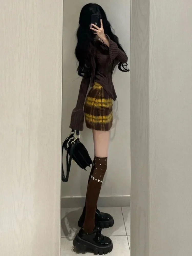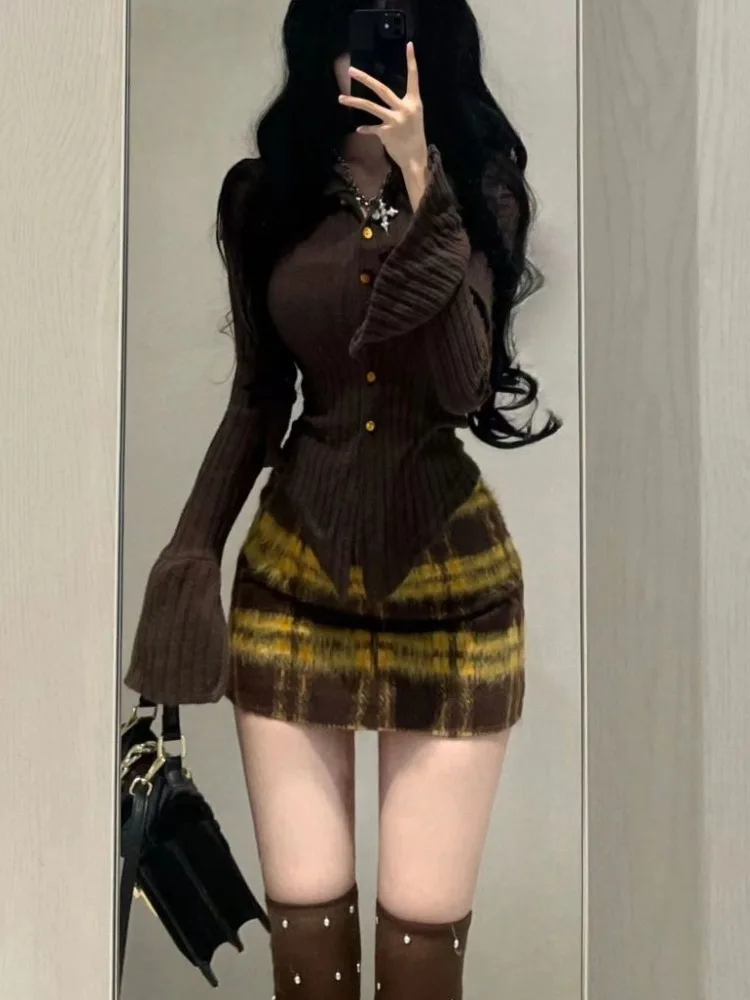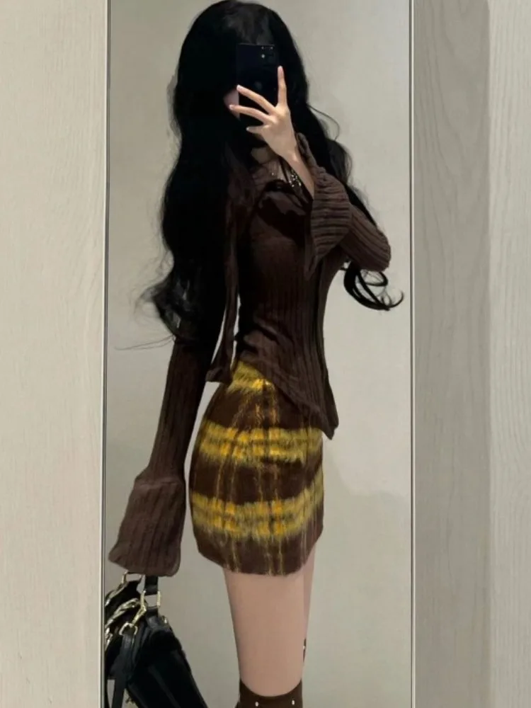 Women Clothing Fashion 2 Piece Sets Knit Irregular Flare Sleeve Crop Tops High Waist Bodycon Mini Skirt Outfits Korean Y2k Suit