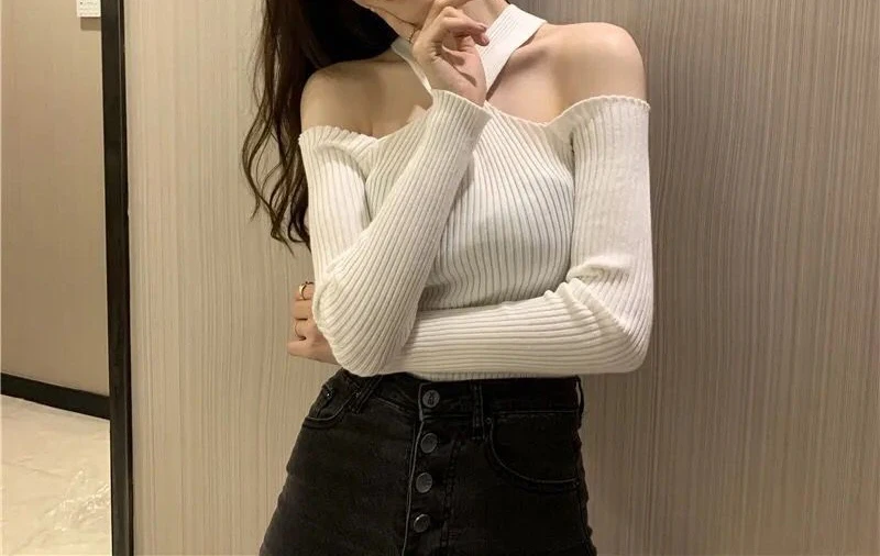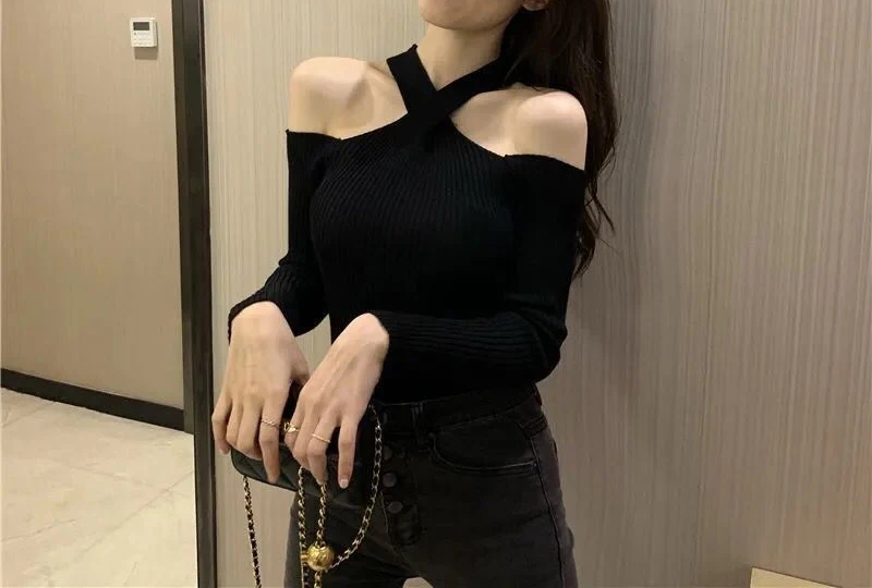 Women Cross Neck Halter Sweater Off Shoulder Jumpers Knit Long Sleeve Warm Pullovers Casual Sweater Women Autumn Winter