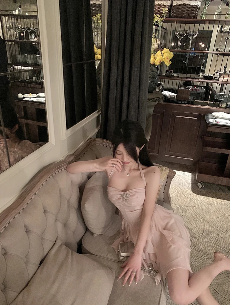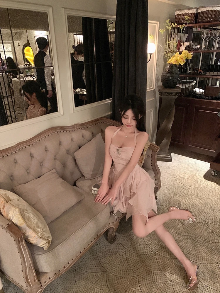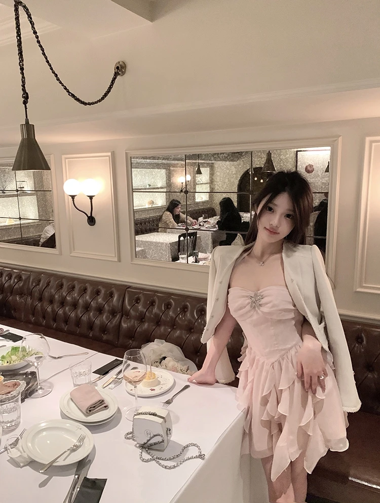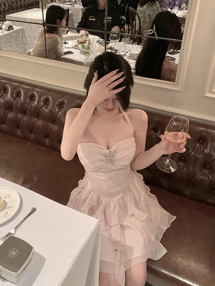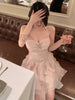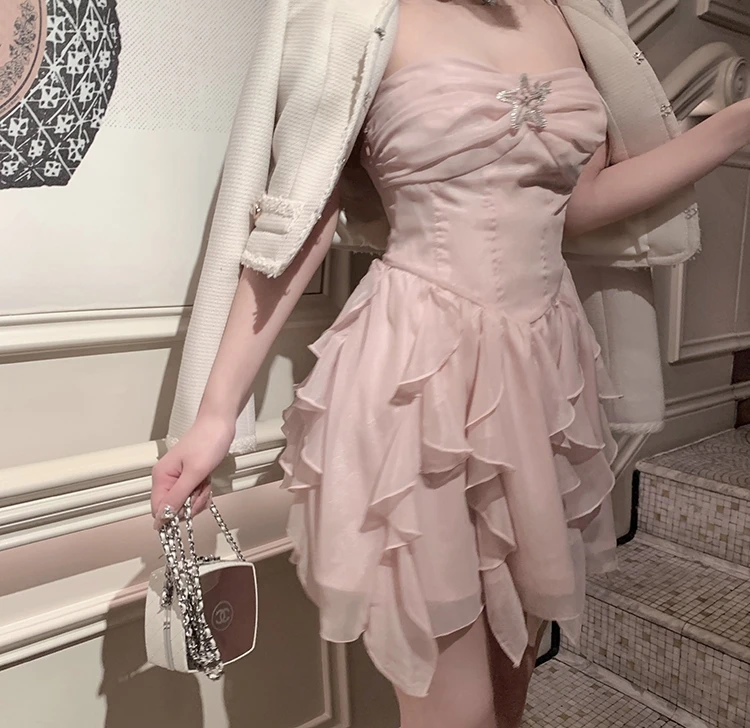 Women Elegant Mini Dress y2k Summer French Style Diamond Ruffles Pink Sexy Sweet Dresses Ladies Birthday Party Club Outfits