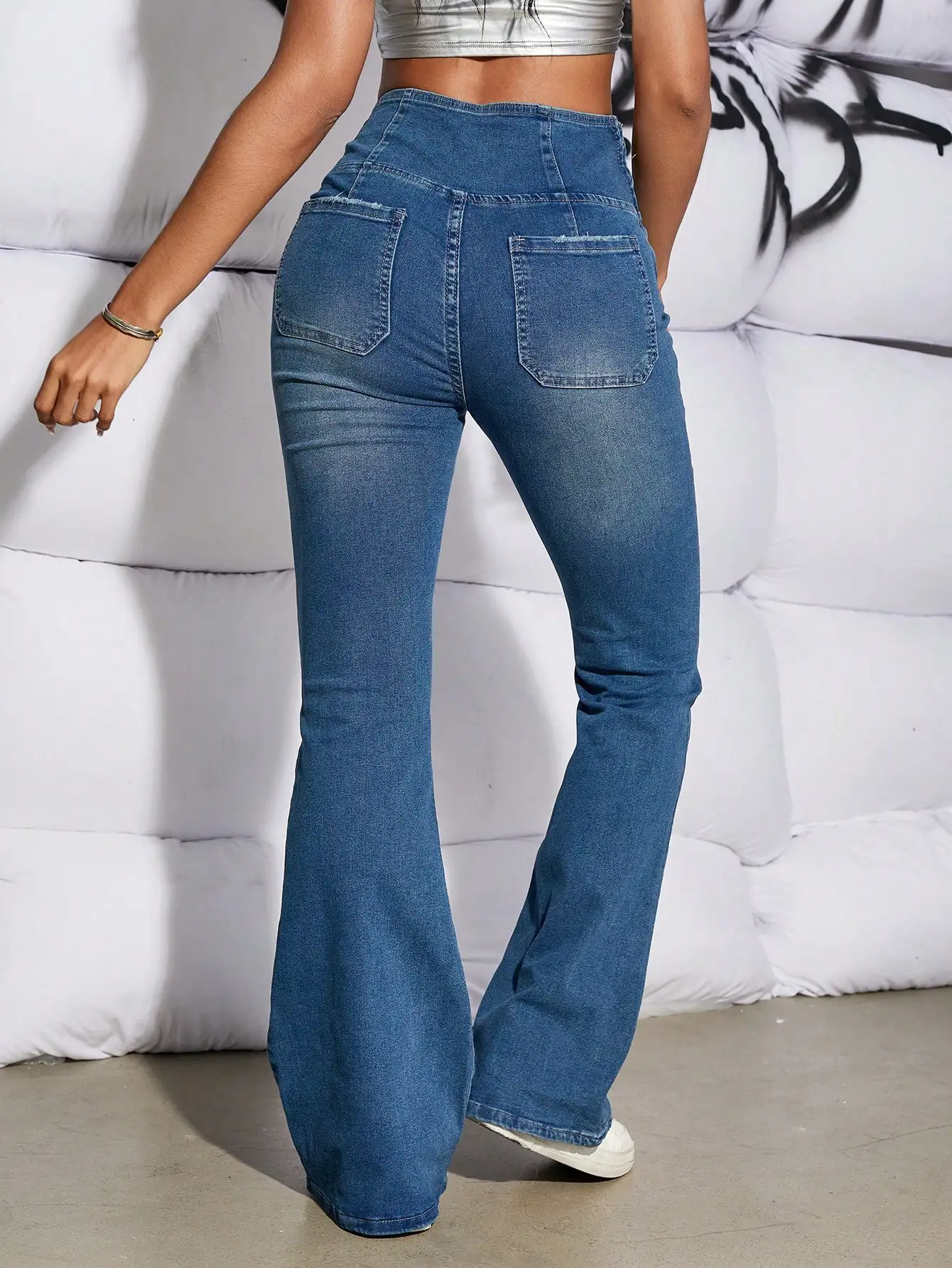 Women Fashion Chic Flare Leg Jeans Rave Festival V Asymmetric Waist Patched Pocket Slim Denim Pants Mujer