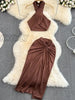 Women Fashion Summer Solid Skirts Suit Halter Sexy Cropped Tops Bodycon Saya 2 Pieces Female Beach Holiday Outfits New