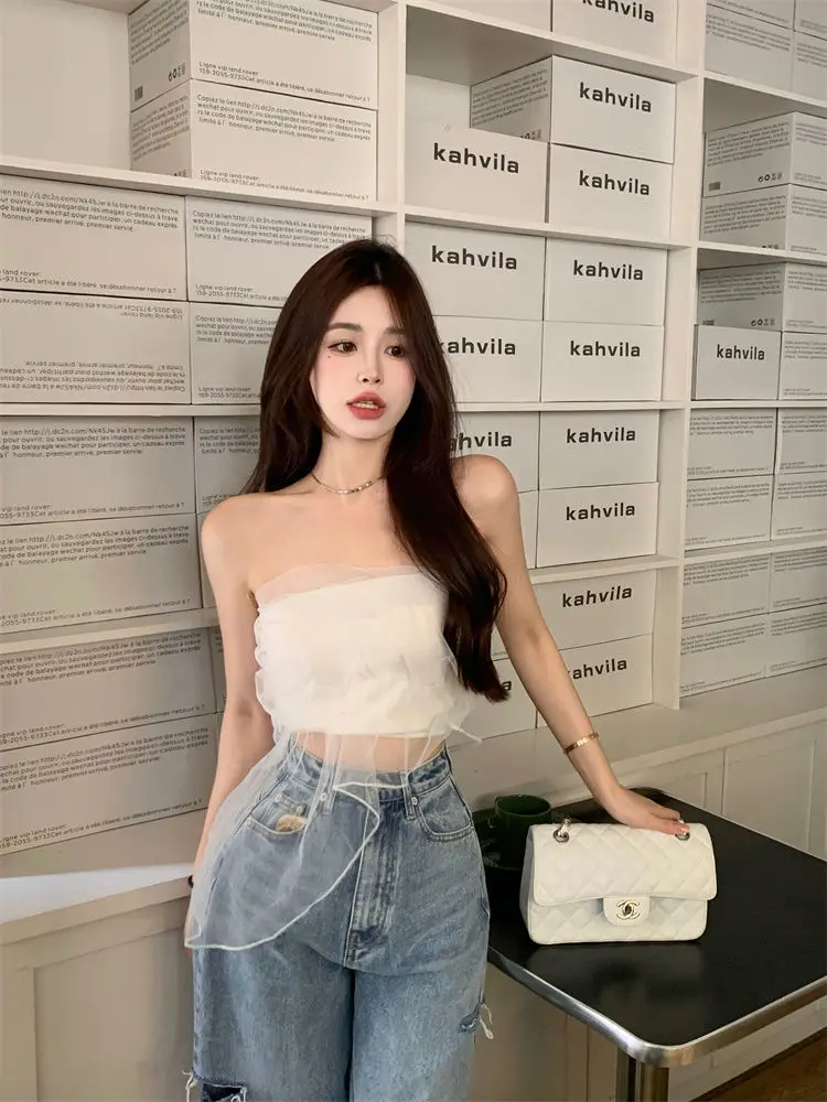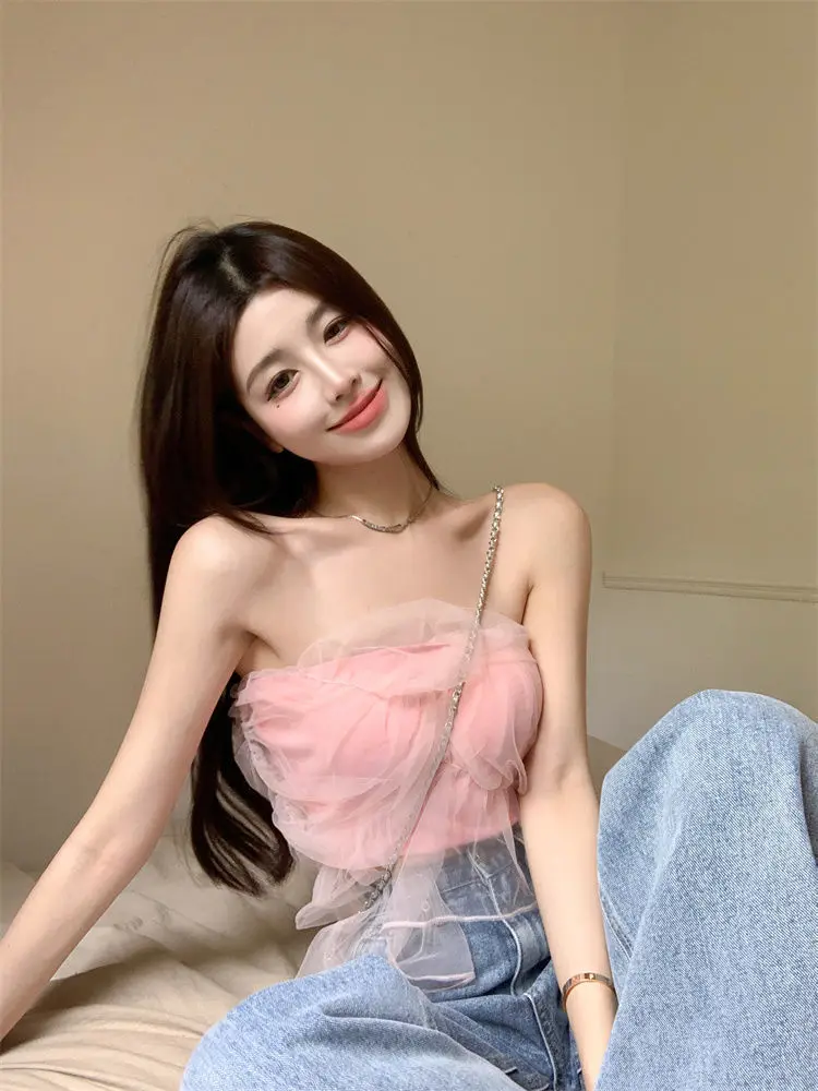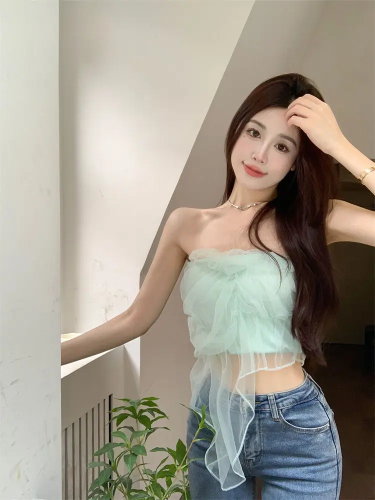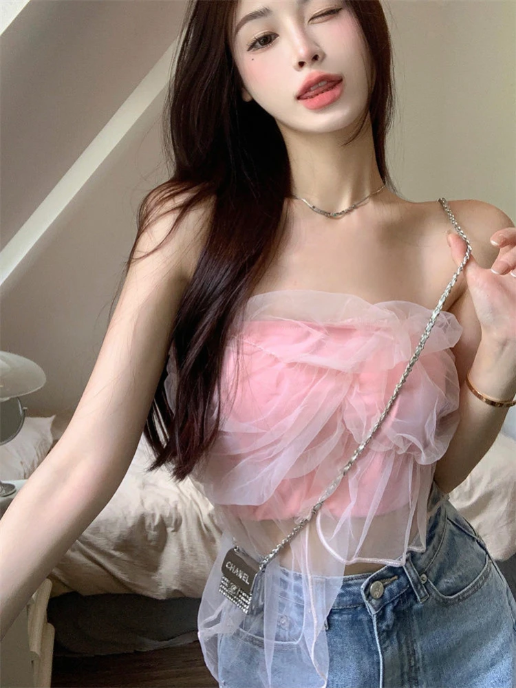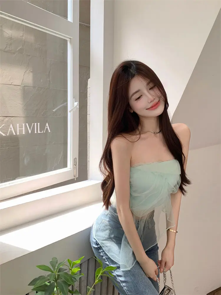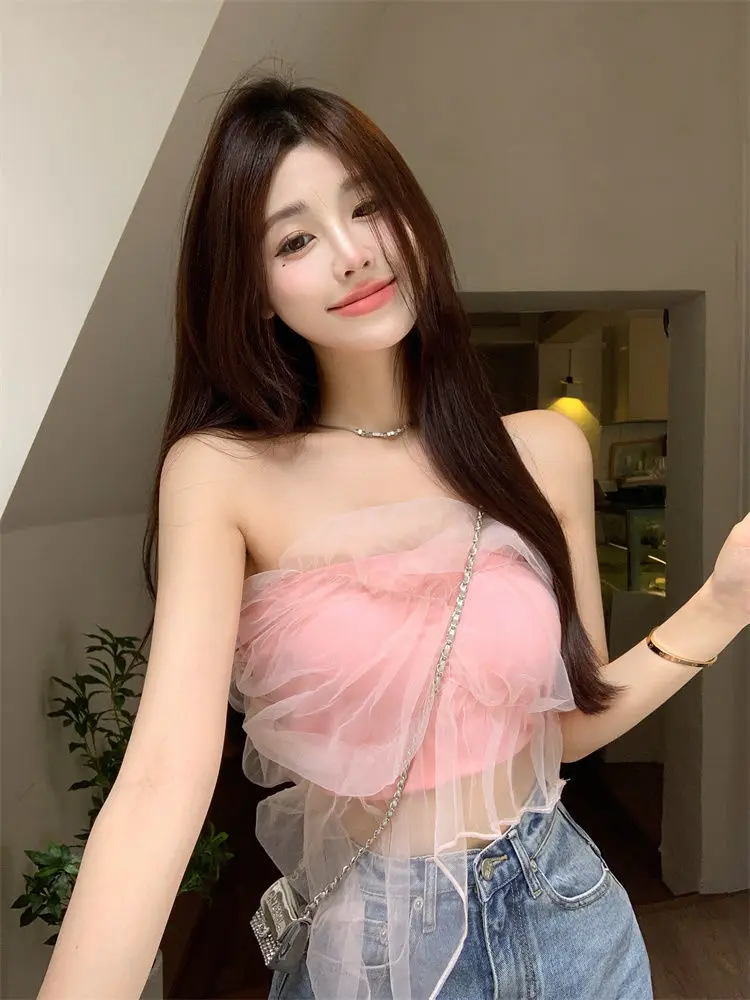 Women Gauze Sweet Girl Strapless Korean Style New Crop Tops Ins Summer Slim Fashion Sexy Hot Lady Fit Club Wear Aesthetics