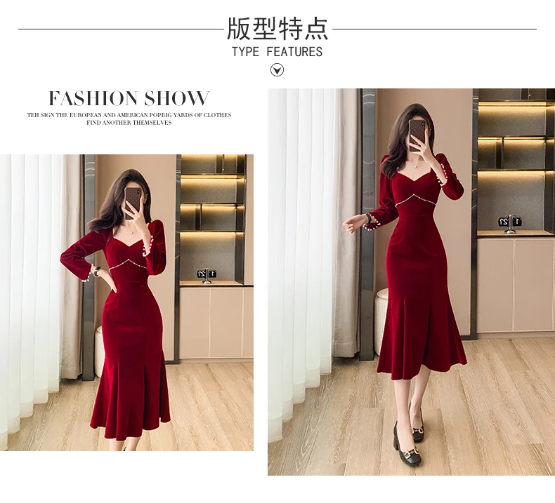 Women Red Velvet Elegant Christmas Dress Autumn Winter Chic Diamonds Square Collar Luxury Dress Korean Vintage Night Dress