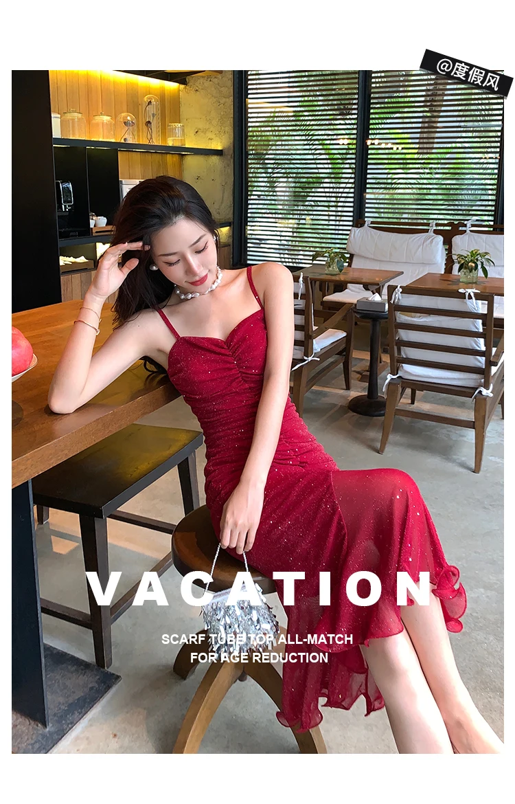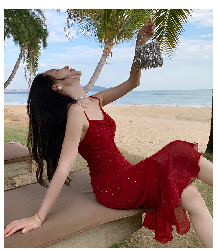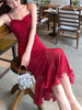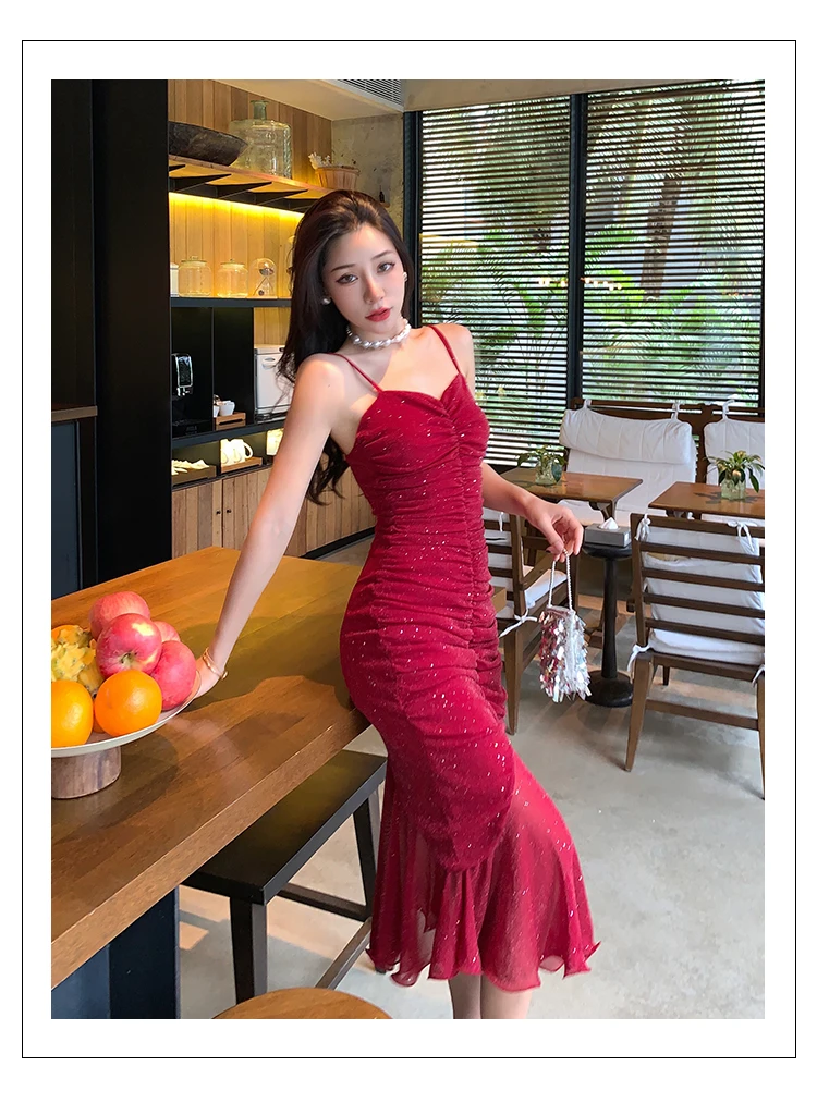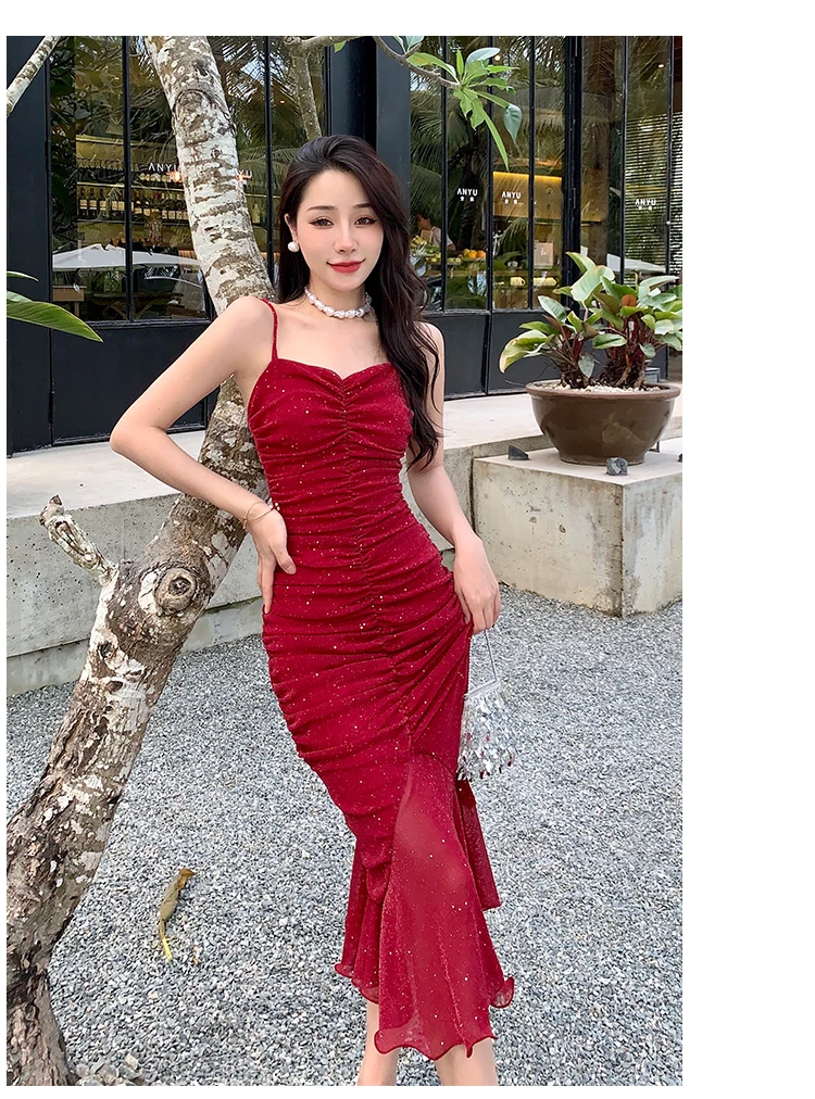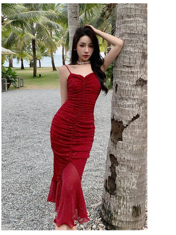 Women Sexy Spaghetti Strap Sleeveless Red Dress Female Backless Mermaid Midi Dresses Vestidos