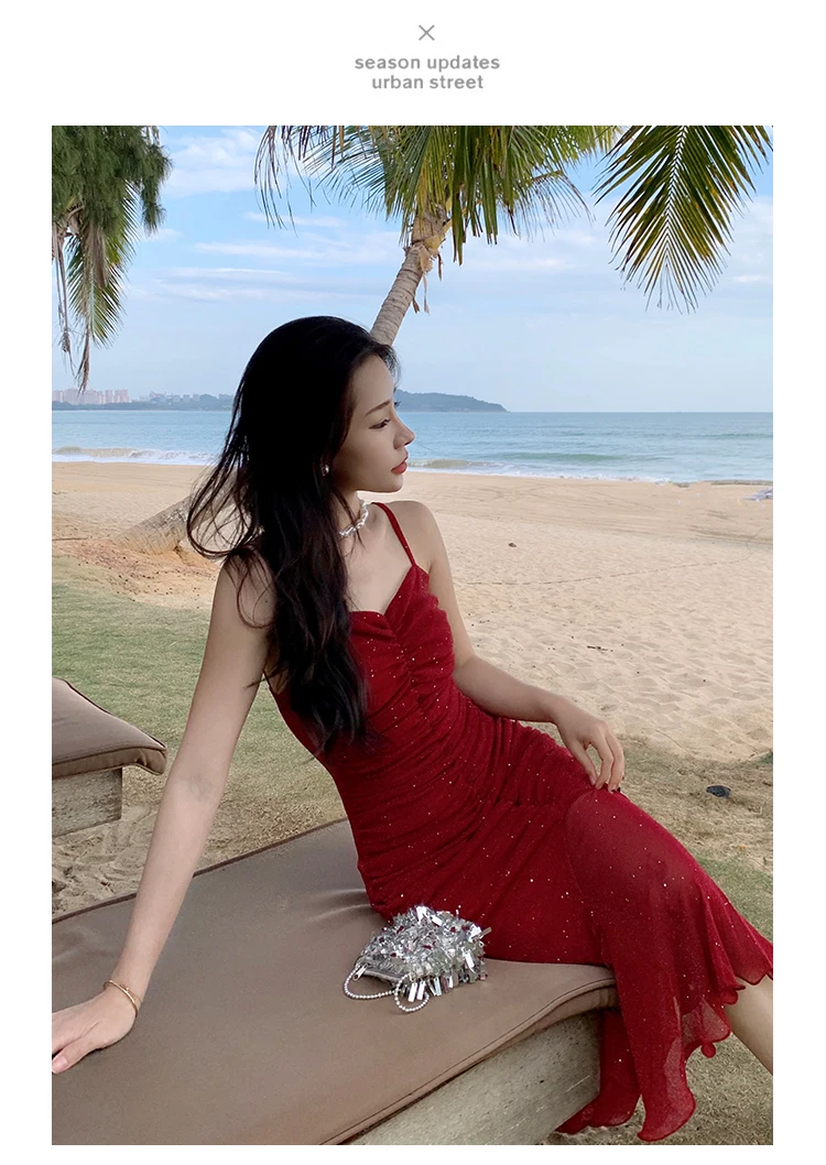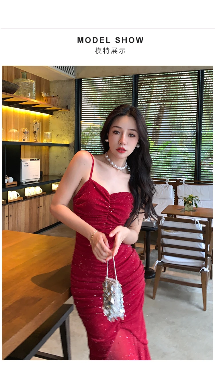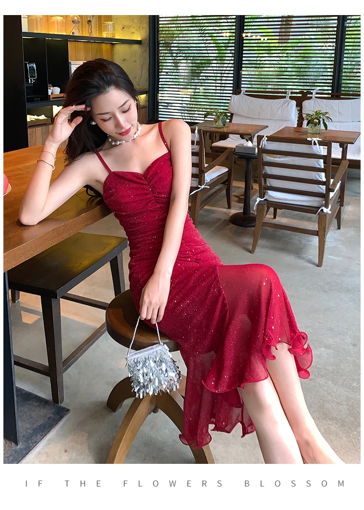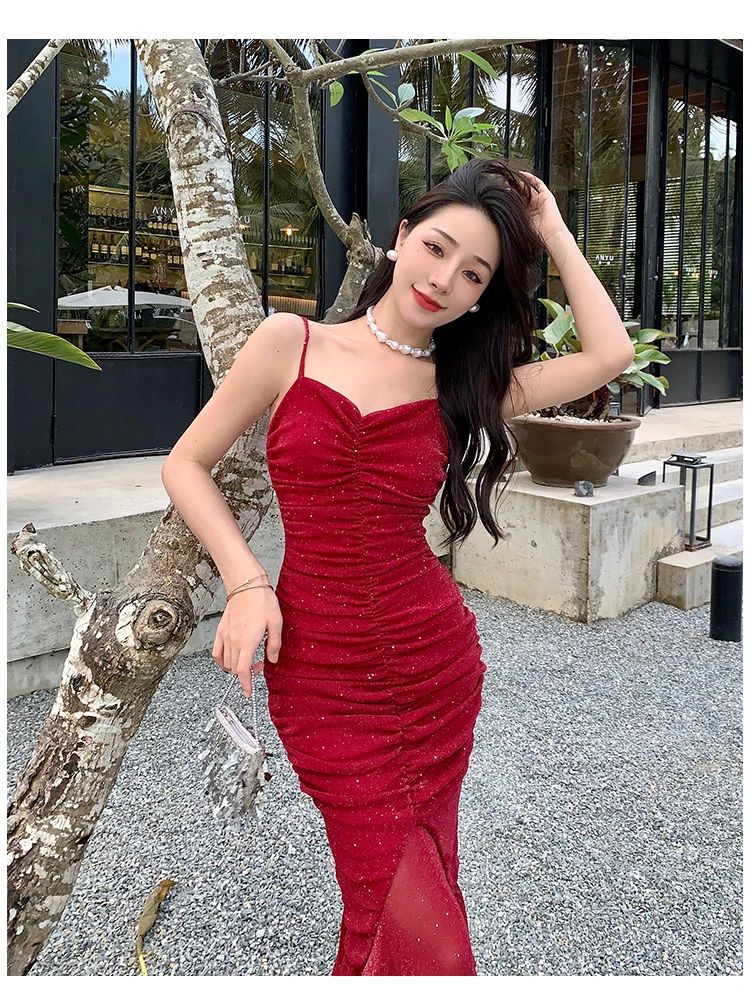 Women Sexy Spaghetti Strap Sleeveless Red Dress Female Backless Mermaid Midi Dresses Vestidos