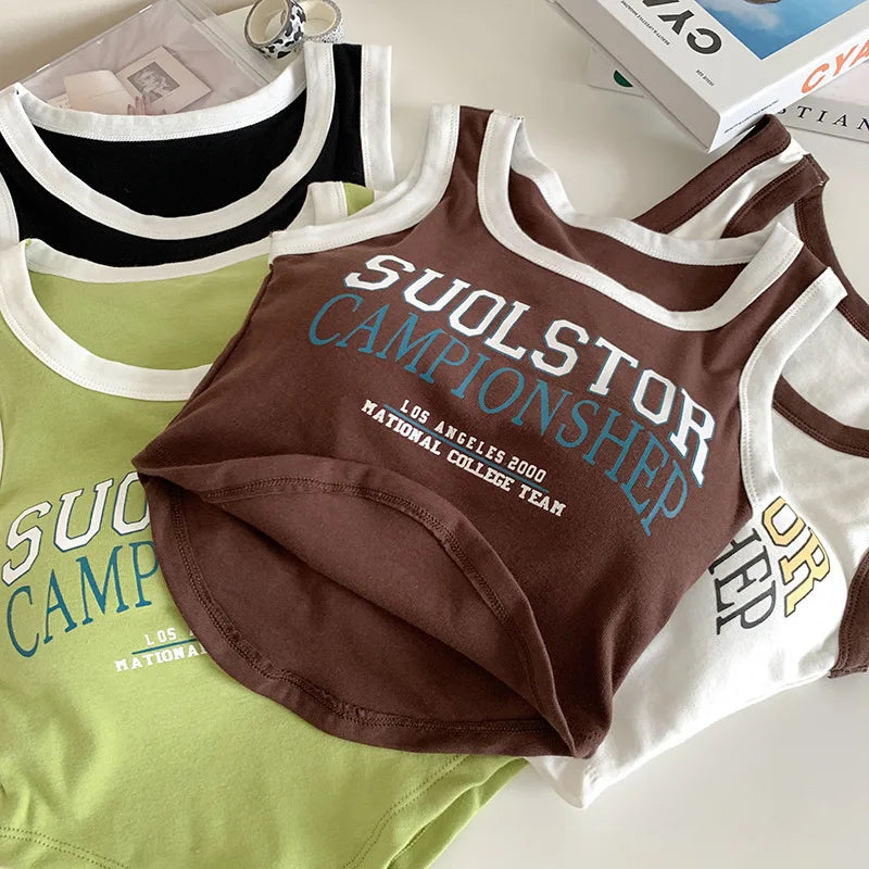 Letter Printed Tank Woman Korean Fashion Colorblock Built In Bra Tanks Women Sleeveless Casual Sport Crop Top