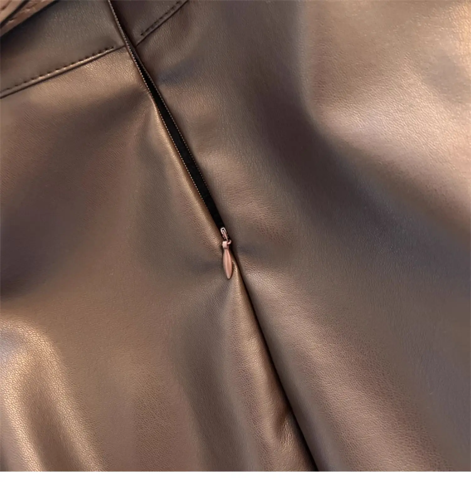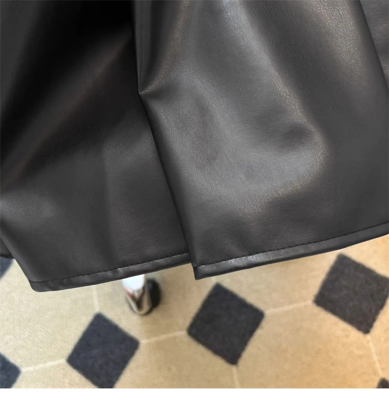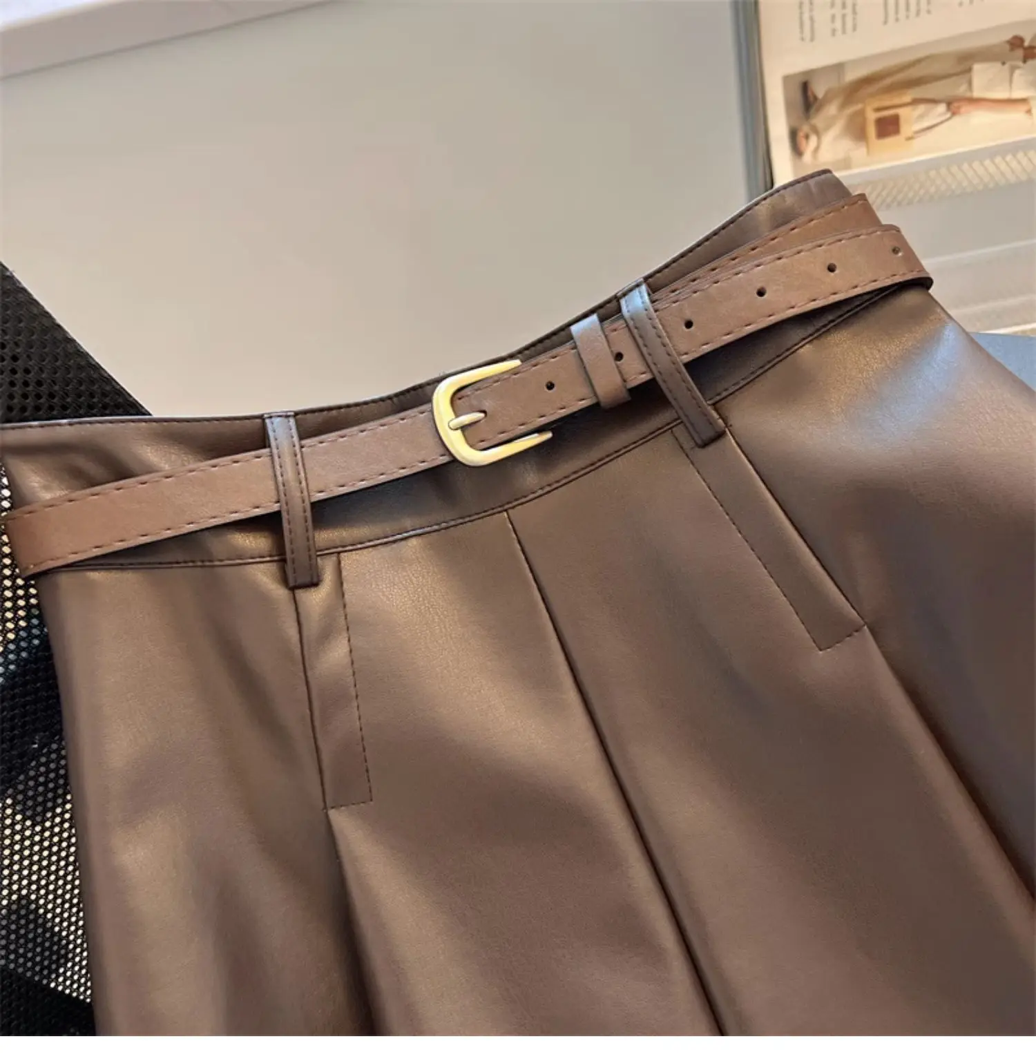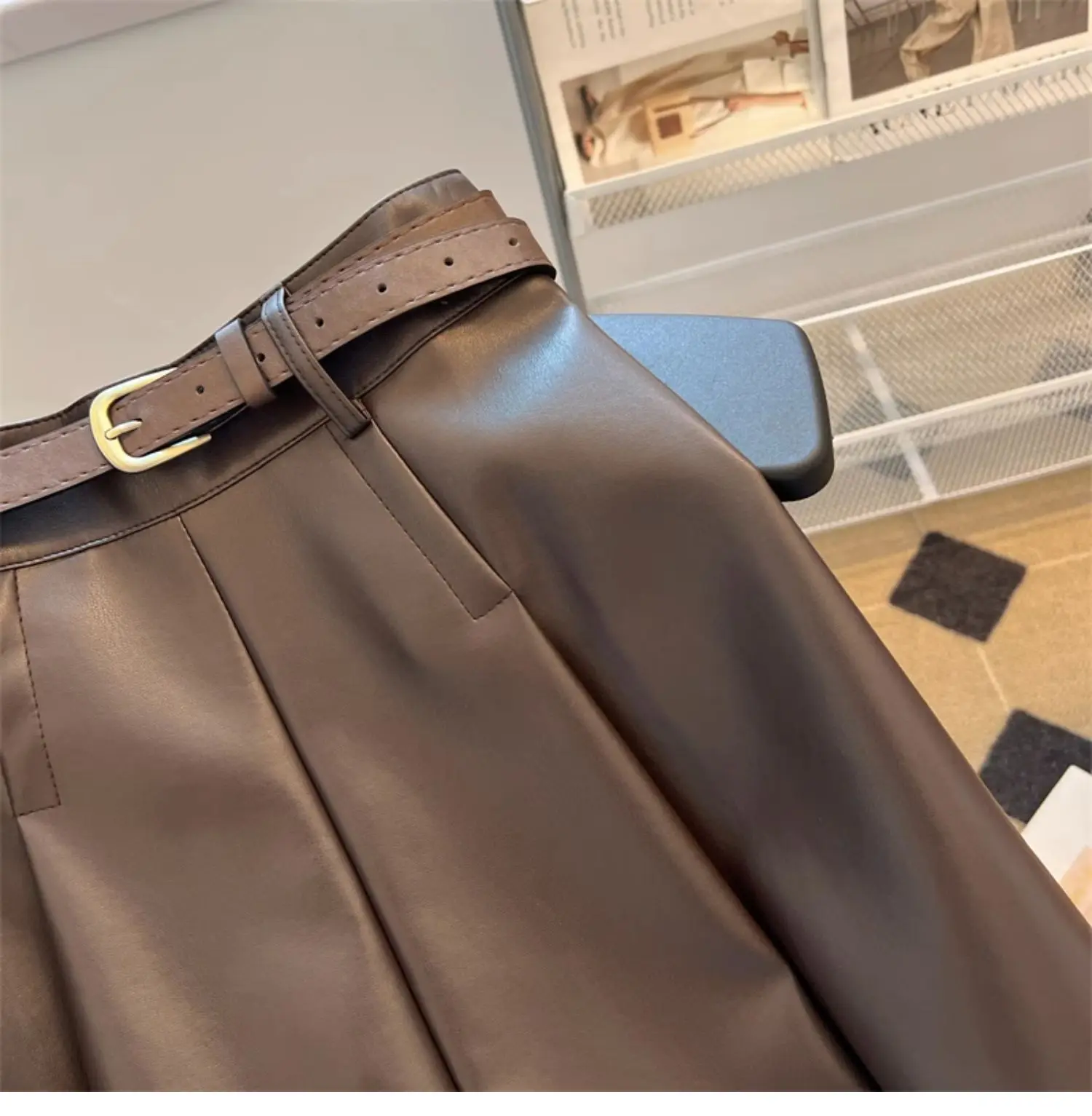Women's A-line Brown Pleated PU Skirt Vintage 90s Aesthetic Y2k Grey Long Skirt Harajuku Korean Skirts 2000s Clothes