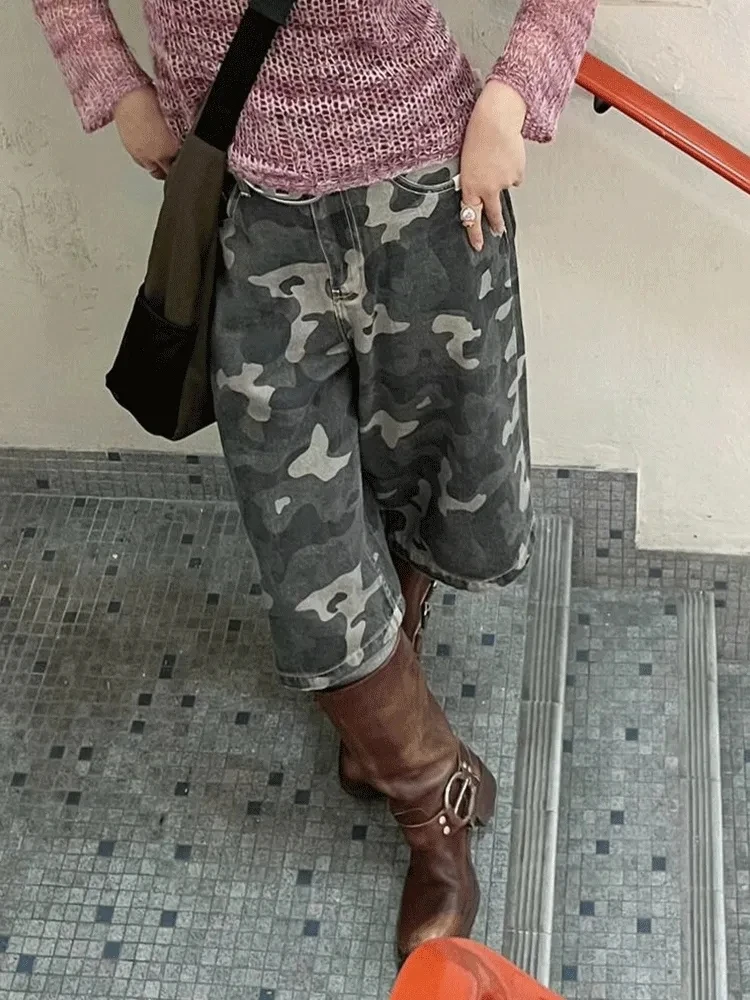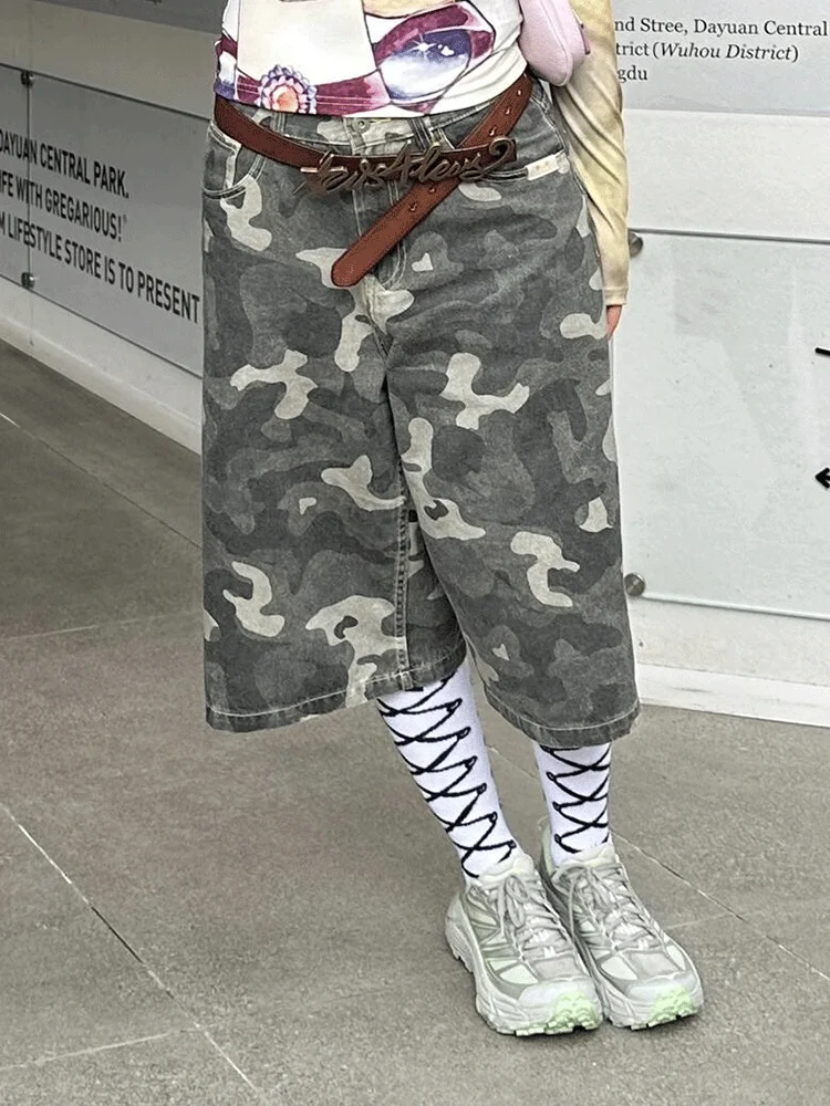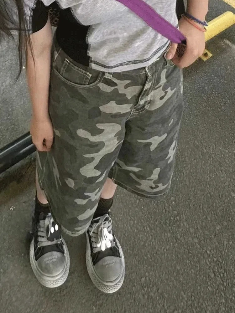 Womens Short Summer Camouflage High Waist Jeans Y2K Straight Calf-Length Pants Trousers Streetwear Vintage Wide Leg Denim Shorts