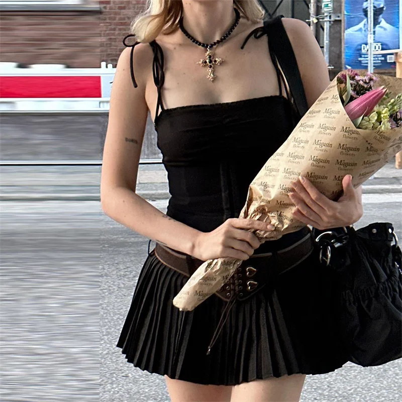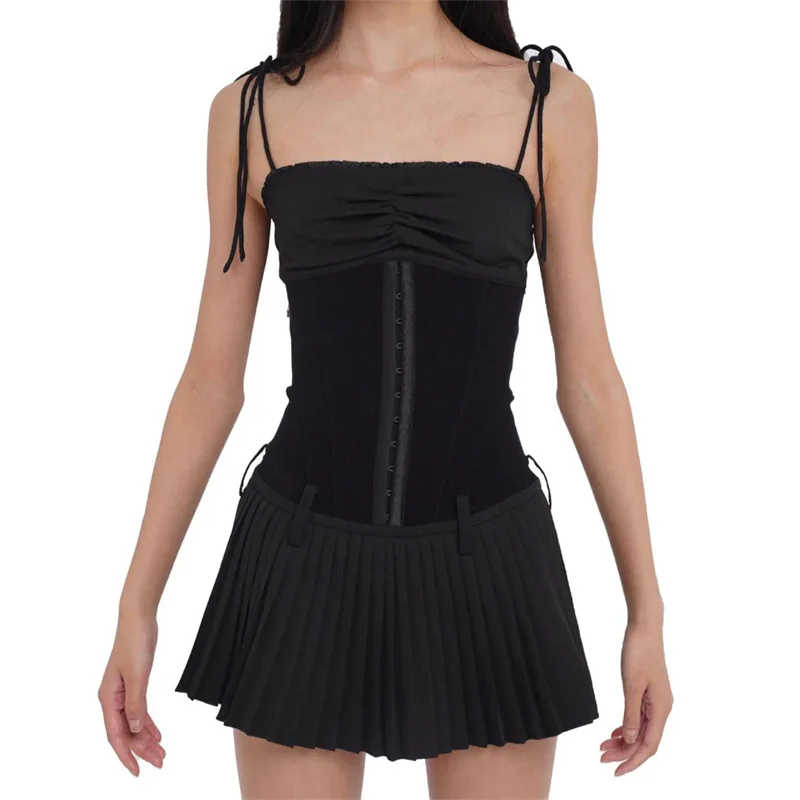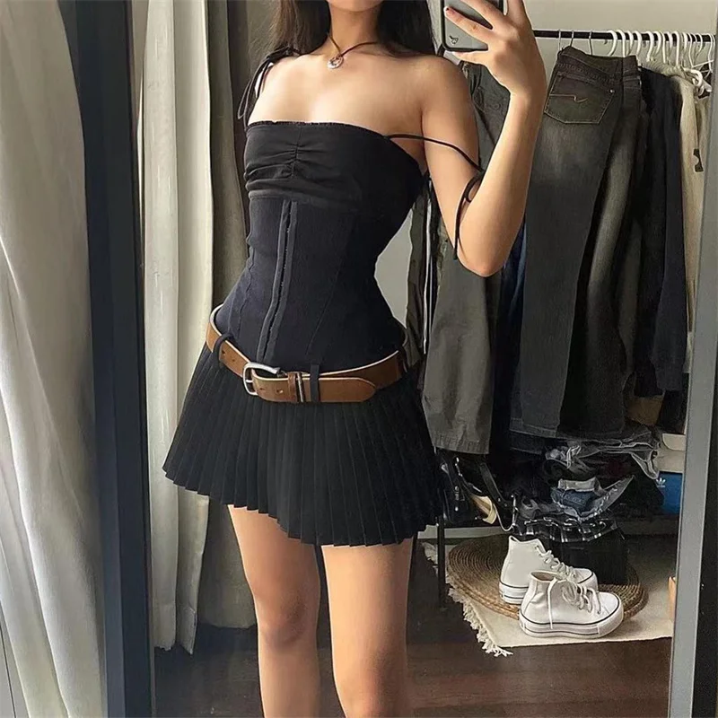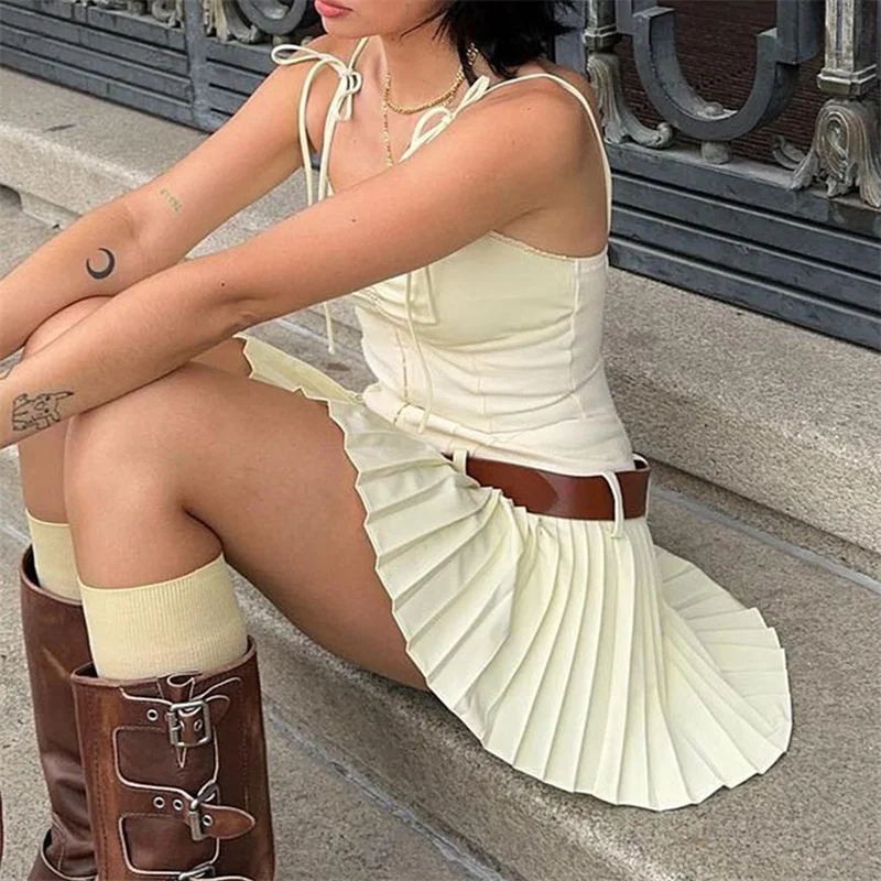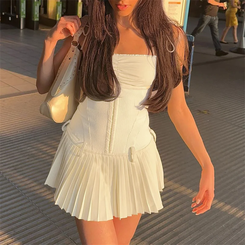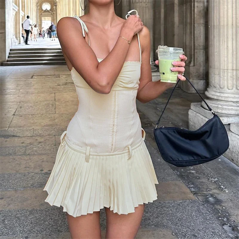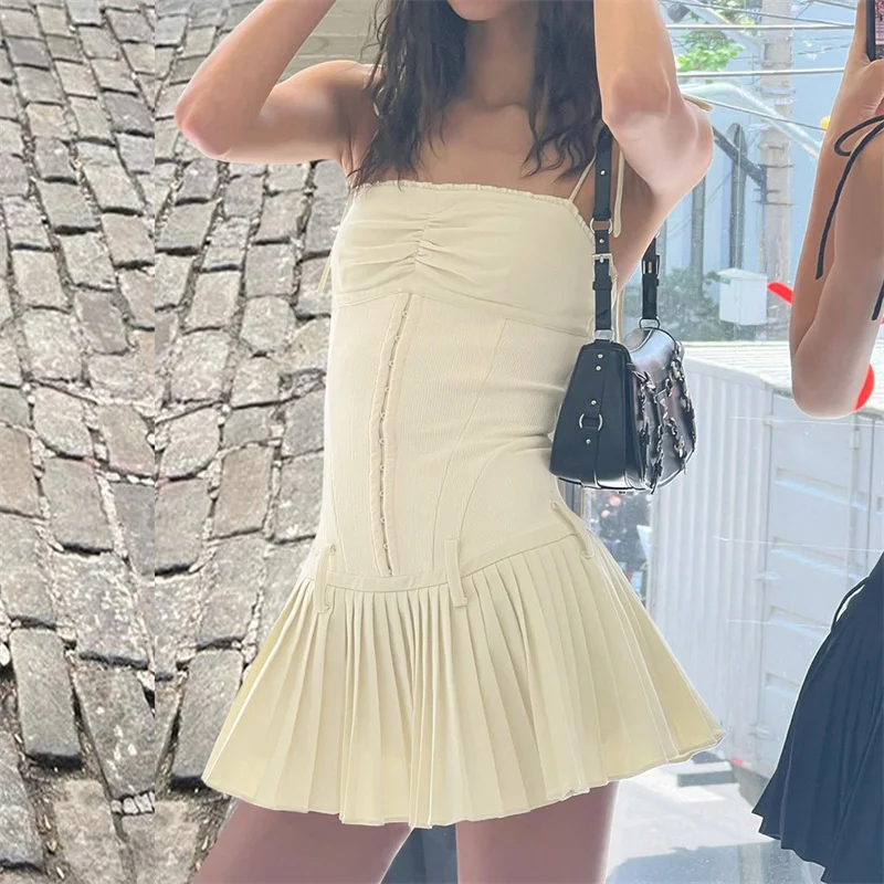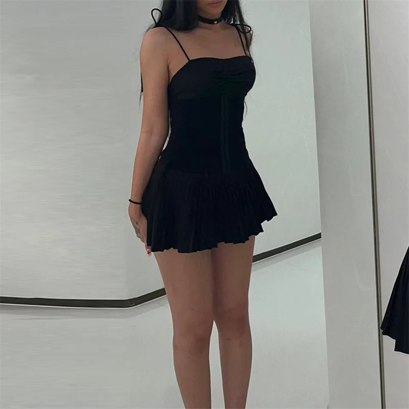 Y2k Fairy Grunge Dress Summer Women Solid Color Spaghetti Strap Sleeveless A Line Pleated Dress Going Out Party Dresses
