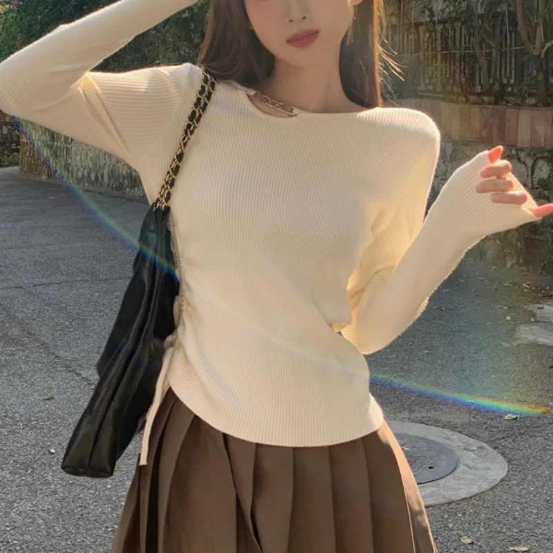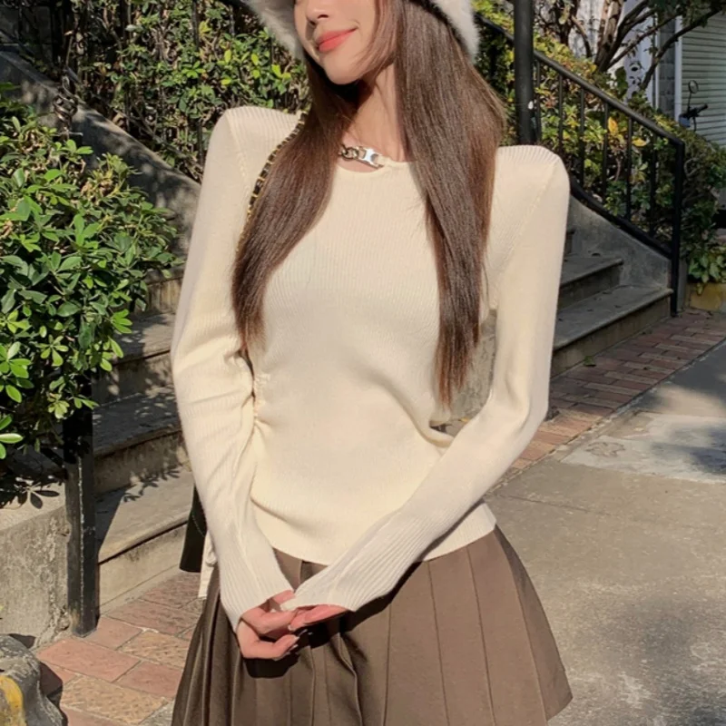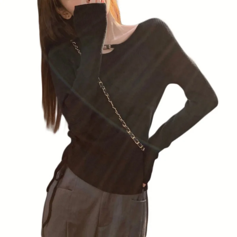y2k Aesthetic Tops Women Clothes Solid Color Metal Chain Decor Round Neck Long Sleeve Knitted T Shirts 2000s Streetwear