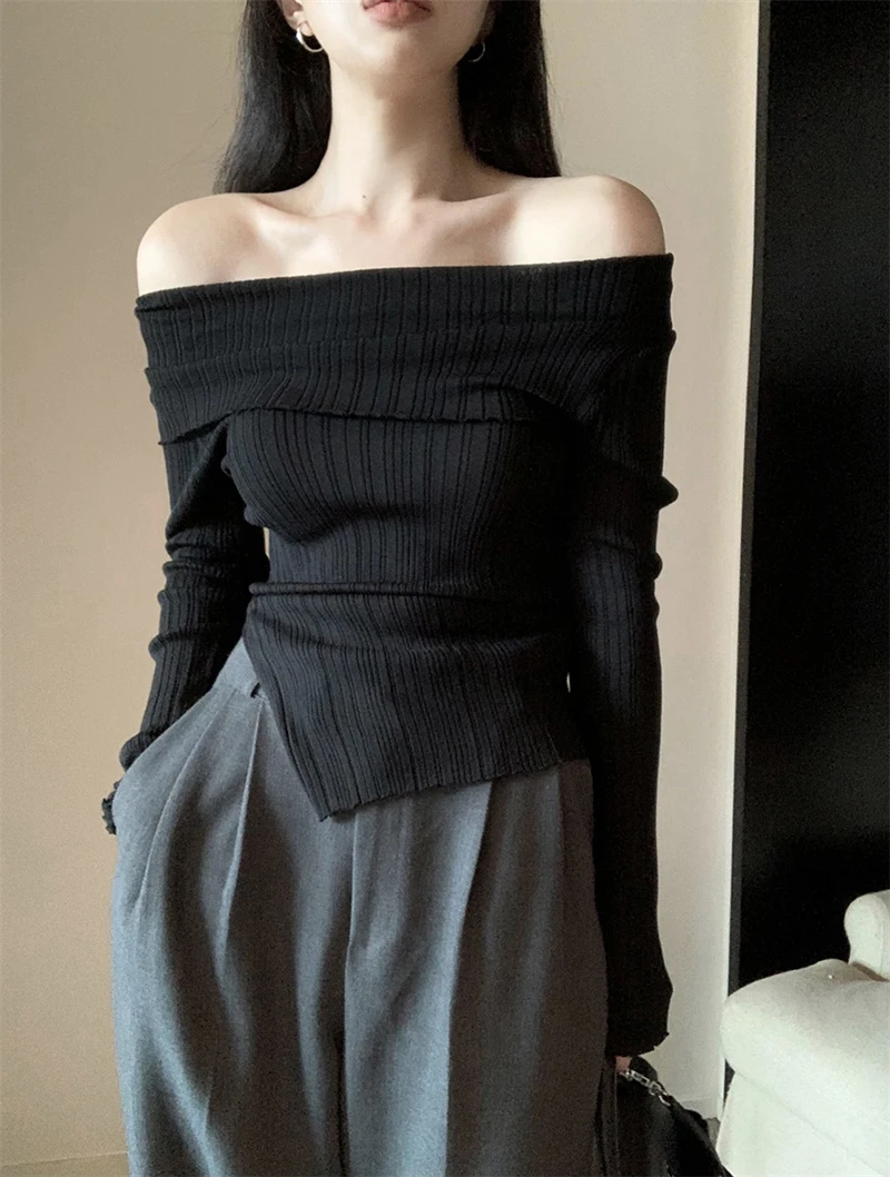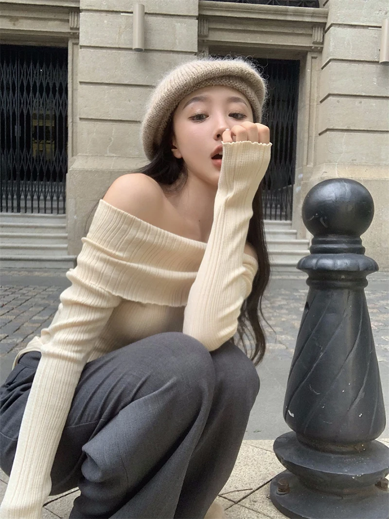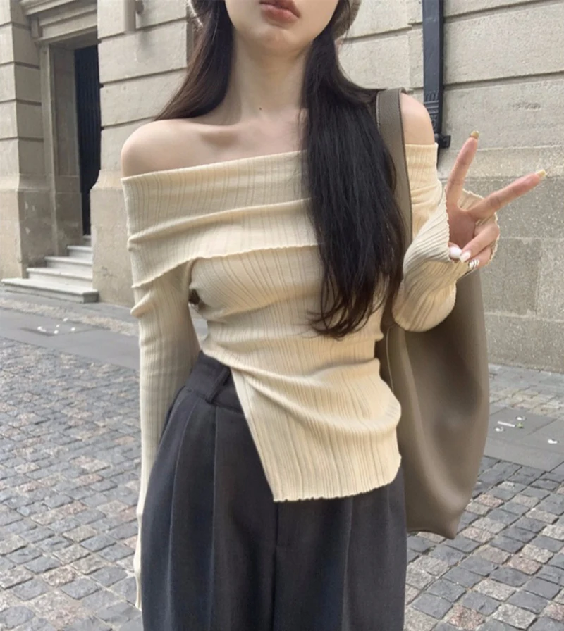 Y2K Korean Women Pullover Sweet Knitted Slim Off Shoulder Long Sleeve Female Sweater Autumn New Irregulate Ladies Casual Jumpers