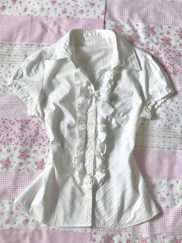 Y2k Tops T shirt 90s Vintage Clothes Women White Punk Slim Bow Aesthetic Lace Harajuku Girl Tees Crop Top Femme Short Sleeve Tee