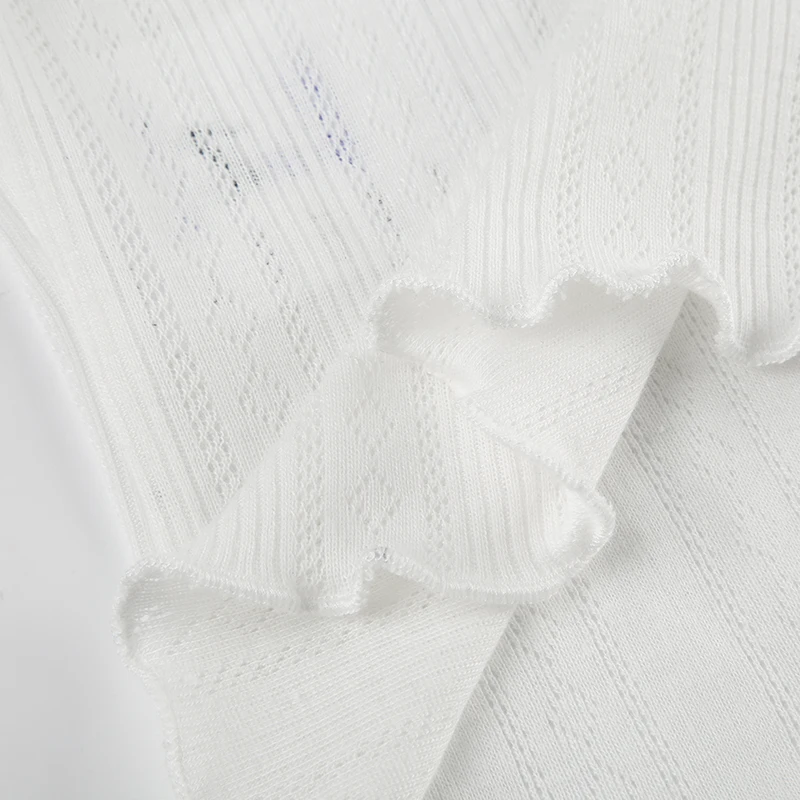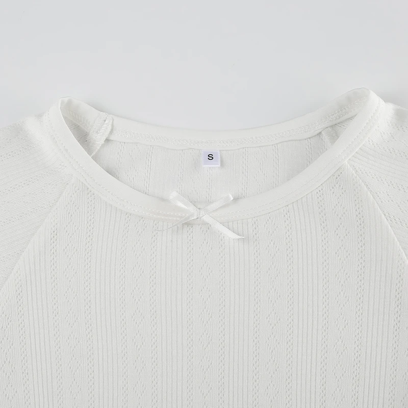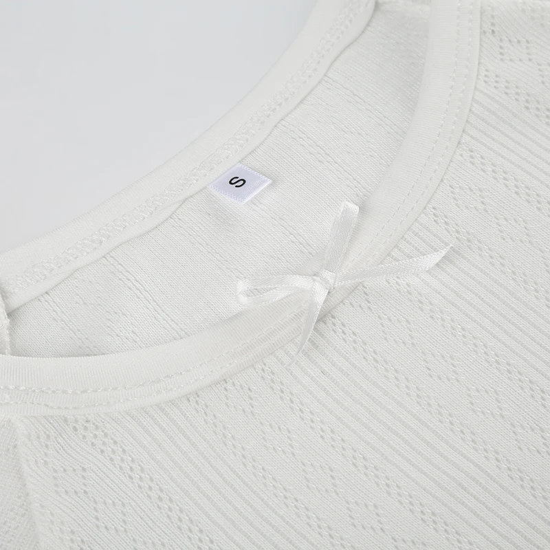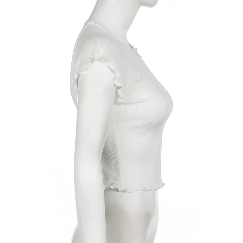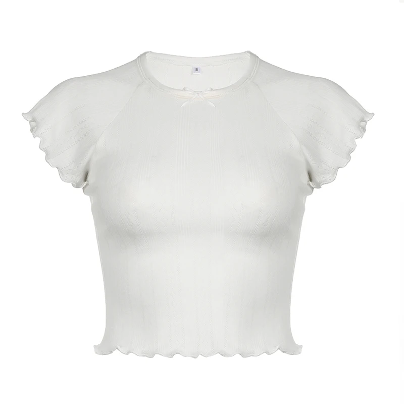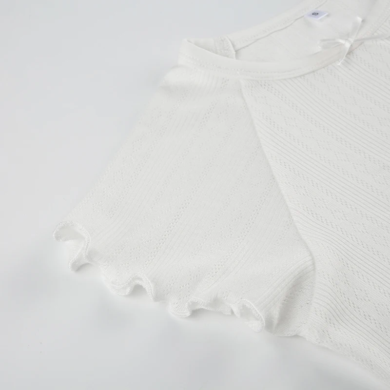 y2k White Short Sleeve Cropped Top Sweet Ruched O Neck Skinny T Shirts Sexy Hollow Out See Through Women T-shirt Vintage